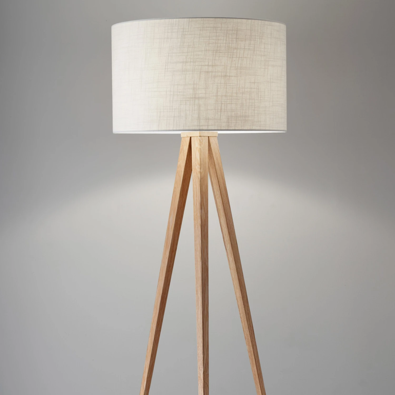Set below a classic drum shade, this eye-catching floor lamp features a splayed tripod base composed of richly figured rubberwood.