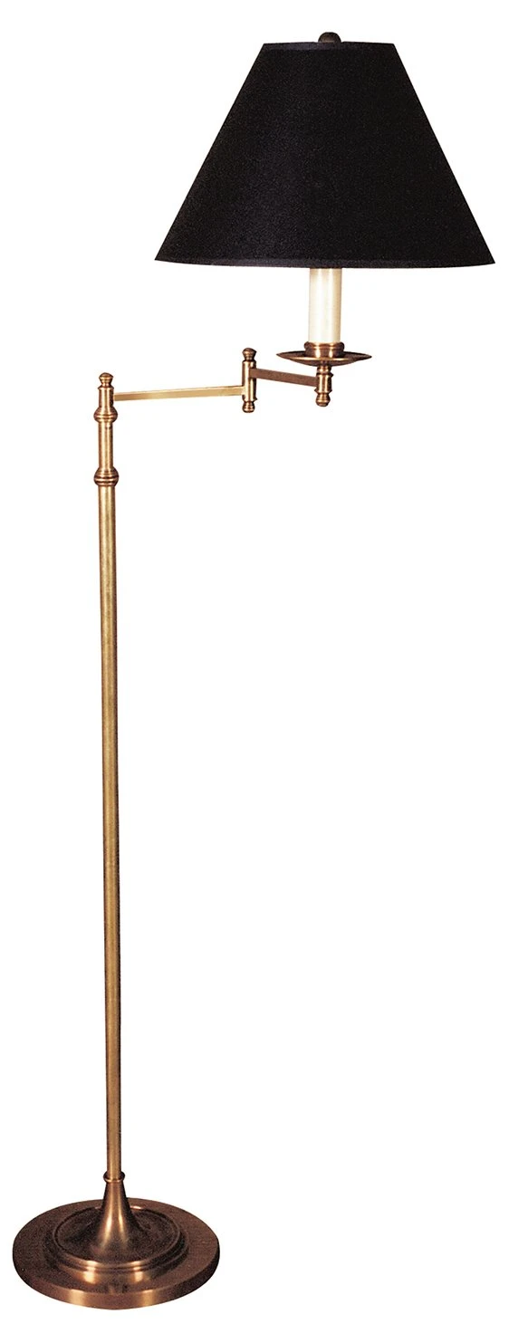 Designed by lighting industry legend E.F. Chapman, this antiqued burnished brass floor lamp features a glossy pedestal sculpted to resemble a vintage candlestick. Its swing-arm design allows you to adjust the direction of the light as you wish. Topped with a black paper shade and a round finial.