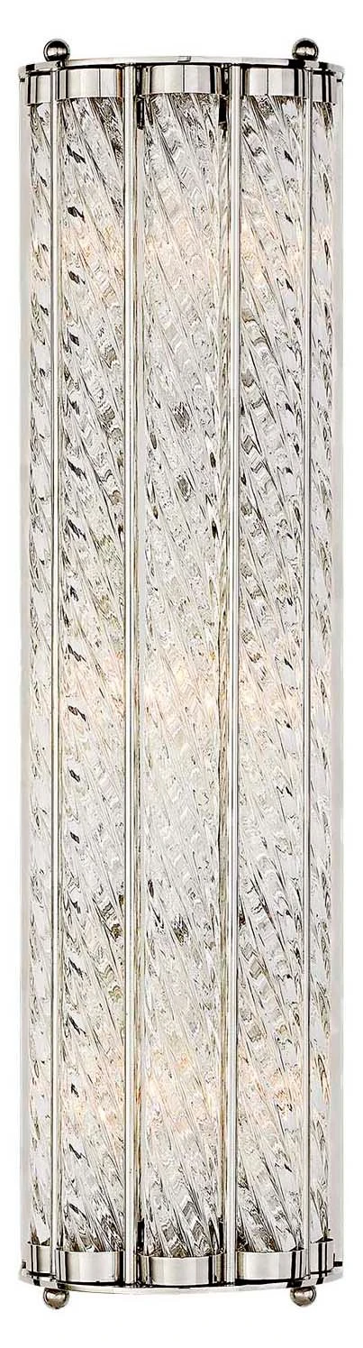 This sconce dresses the room in decadent elegance with its antiqued brass nickel frame and spiraling glass columns. Hardwired.
