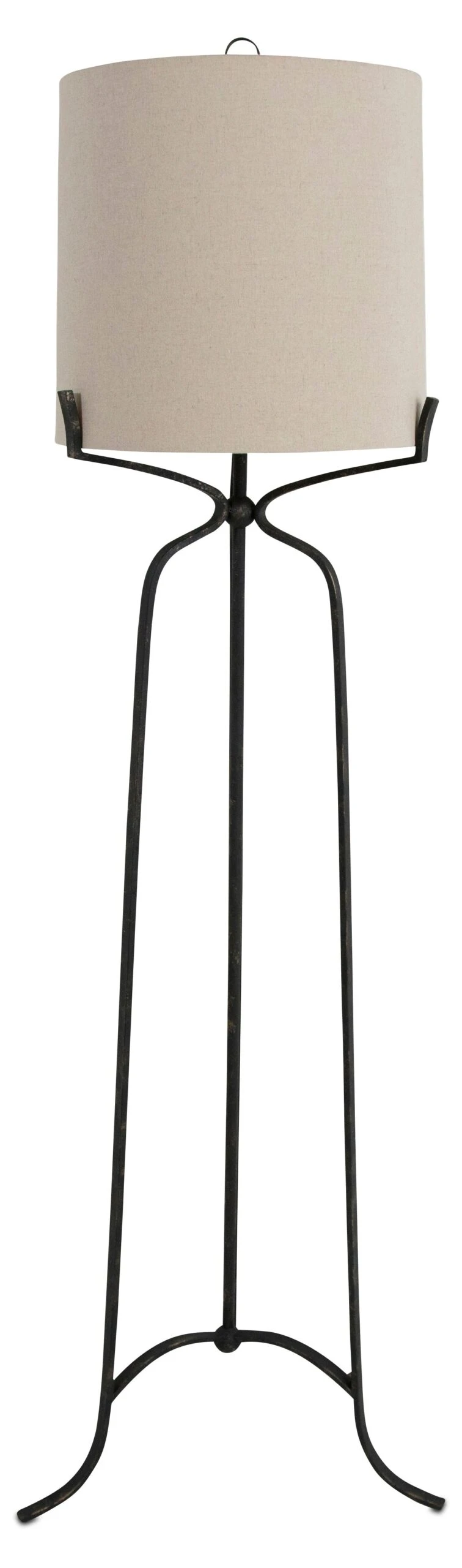 This floor lamp is crafted of iron with an unexpected, minimalist silhouette, which includes flared legs and upturned arms that hold its neutral linen shade. An antiqued bronze finish completes the look.