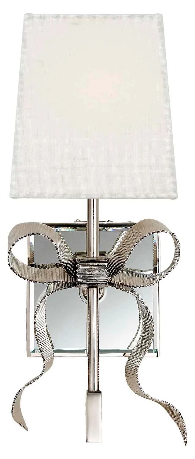 A beautifully crafted brass bow dresses the otherwise simple form of this sconce with charm and elegance. A mirrored glass backplate and neutral linen shade complete the design.