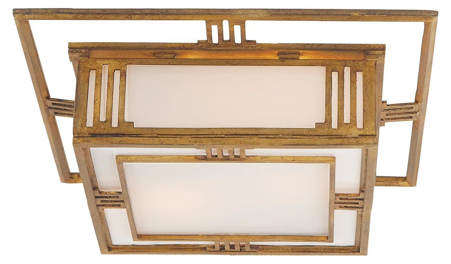 Despite the low profile of this flush mount, it doesn’t skimp on Art Deco-inspired glamour, with a lovely grid pattern in gilded iron. Hardwired.