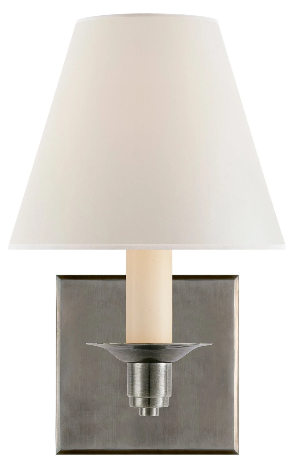 This sconce features a simple design that allows it to work in a variety of interiors. A white cotton percale shades completes the design. Hardwired.