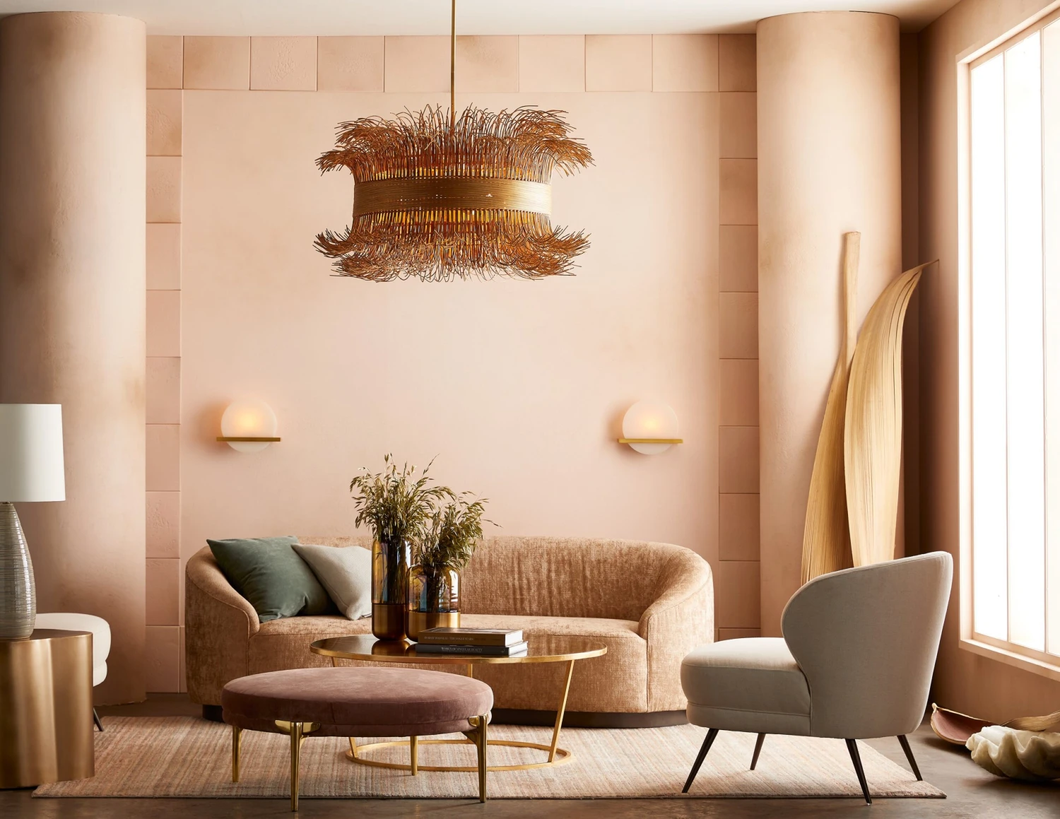 Naturally chic, this chandelier from Laura Kirar is crafted from free-flowing natural rattan cinched with a steel band finished in gold. Hardwired.