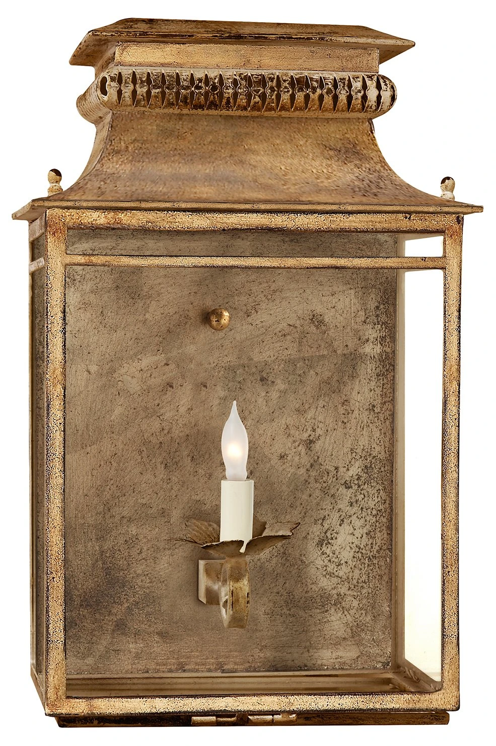Designed by Suzanne Kasler, this gleaming sconce showcases a simple candle-style light perched atop a blossoming bobeche. Framed in gilded iron. Hardwired.