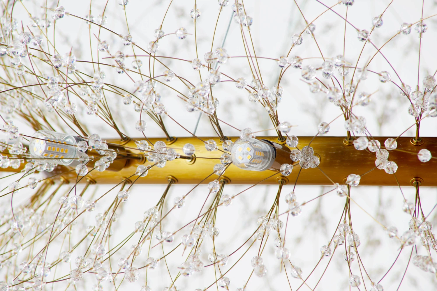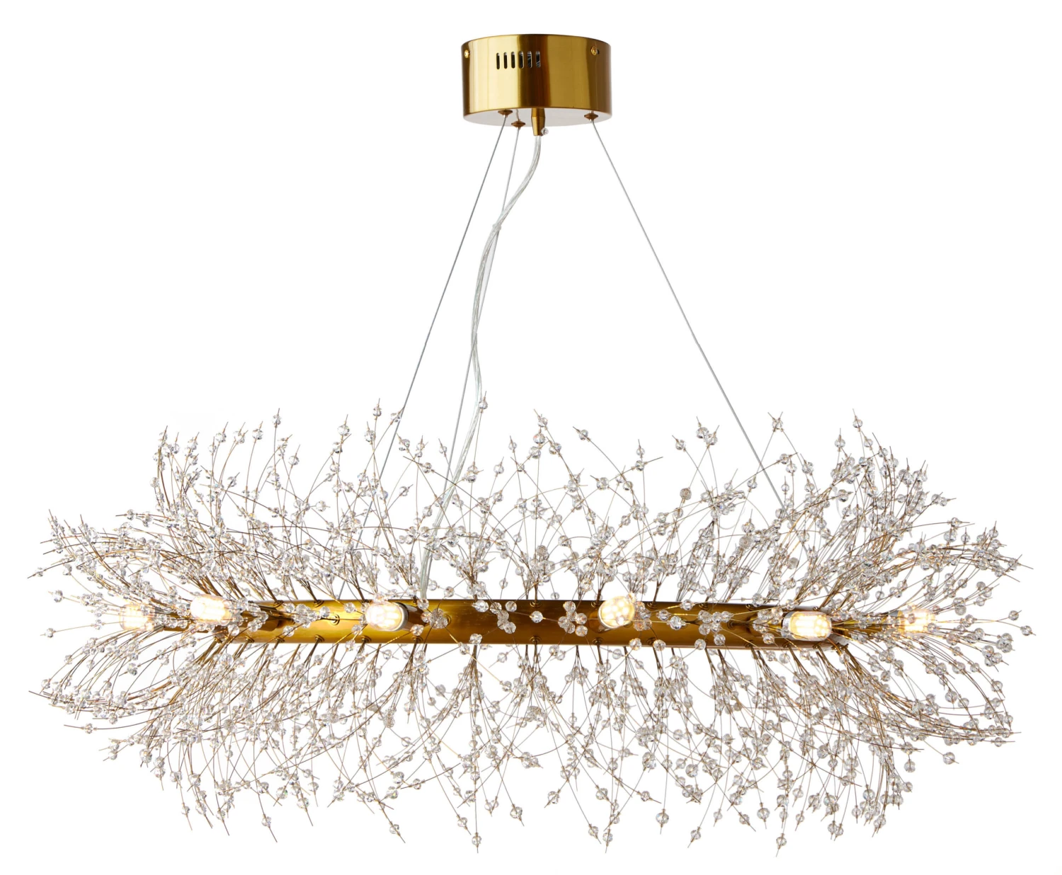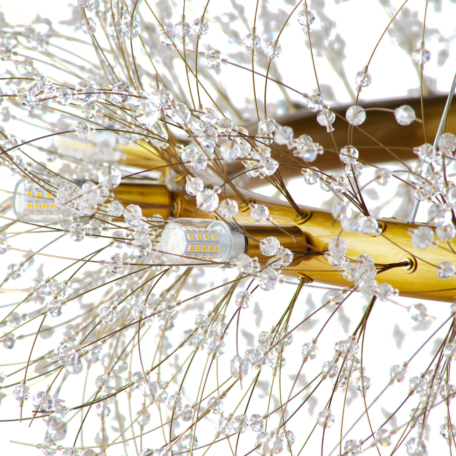 Light-reflecting crystal beads seemingly float around the golden ring of this 12-bulb chandelier, which is compatible with a wall dimmer switch. The style is also available as a pendant.