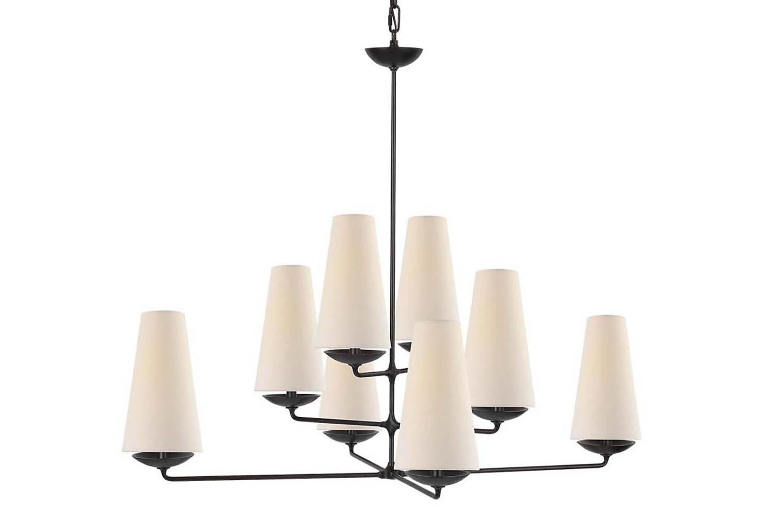 An eye-catching focal point for the entryway or dining room, this chandelier showcases graduated tiers of aged iron arms and tapered white linen shades. Hardwired.