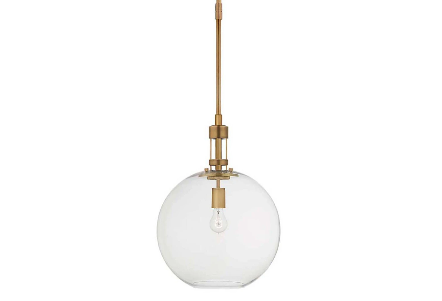 This pendant from designer Thomas O’Brien is simple yet impactful with its hand-rubbed antiqued brass fixture and clear glass globe shade. Hardwired.