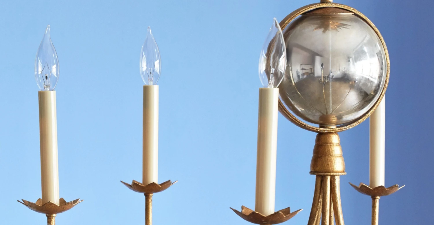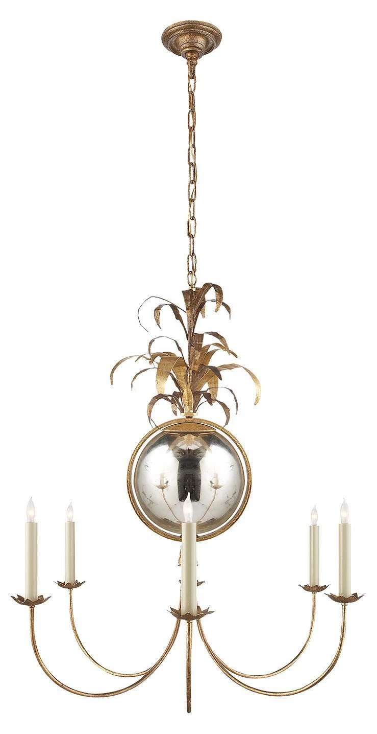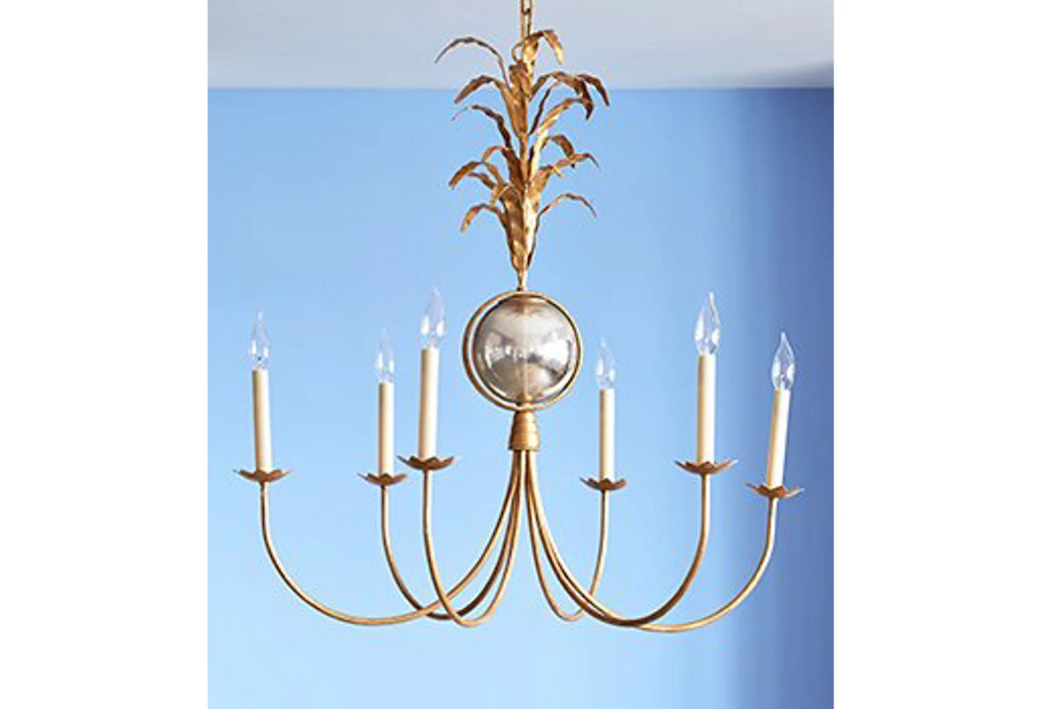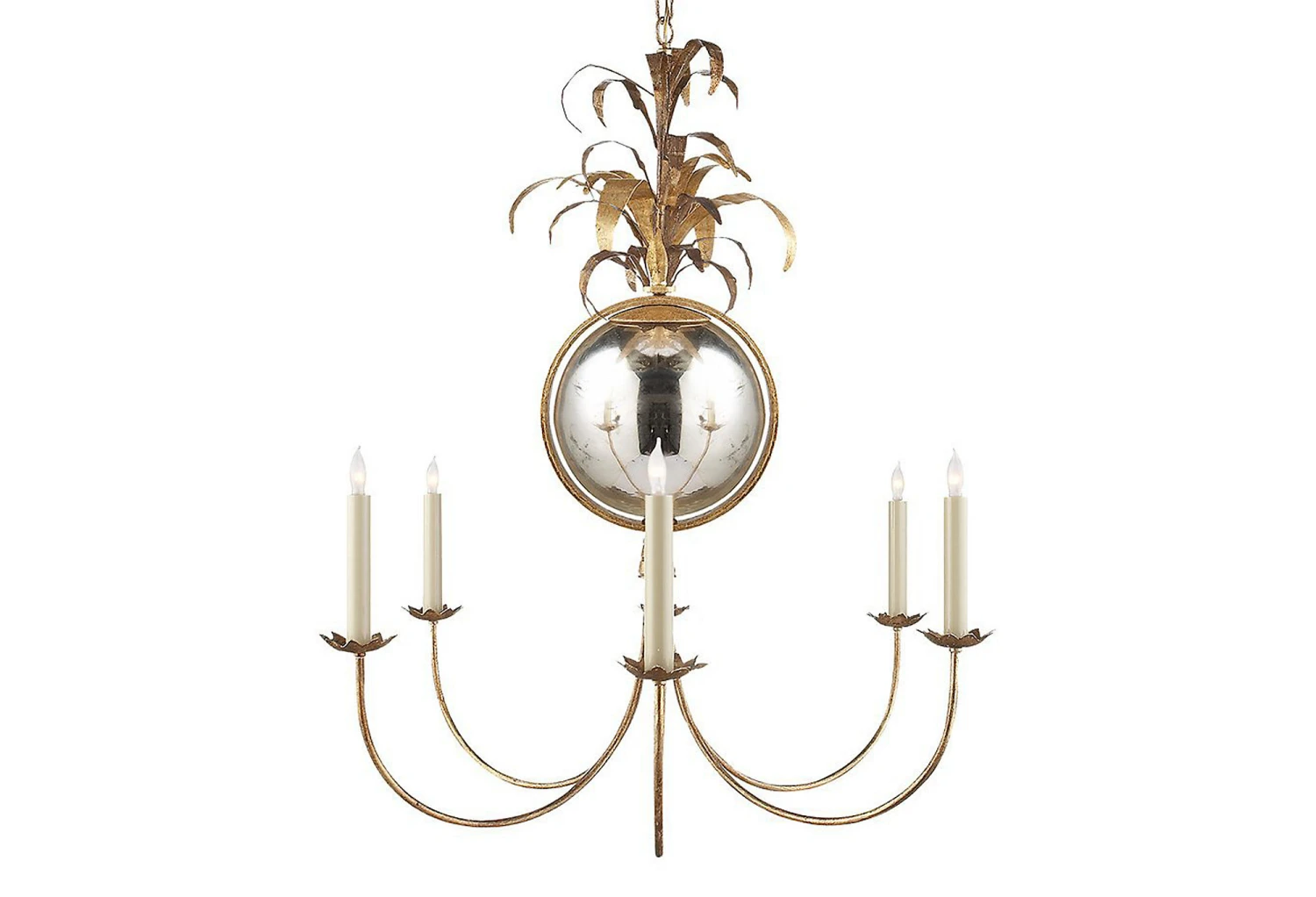This chandelier features leafy accents, long, slender arms holding up candle-inspired lights, and a gleaming central sphere for a whimsical, nostalgic touch. Hardwired.