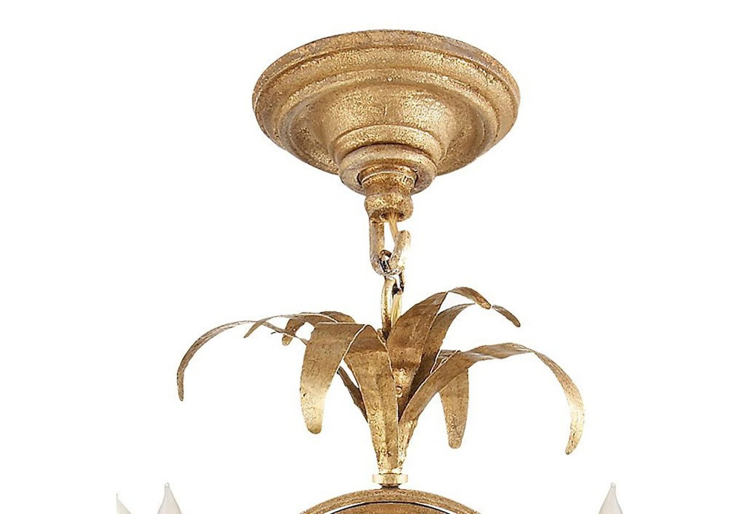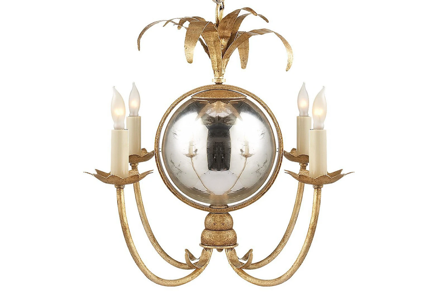 This mini chandelier features leafy accents and a gleaming central sphere for a whimsical, nostalgic touch. Hardwired.