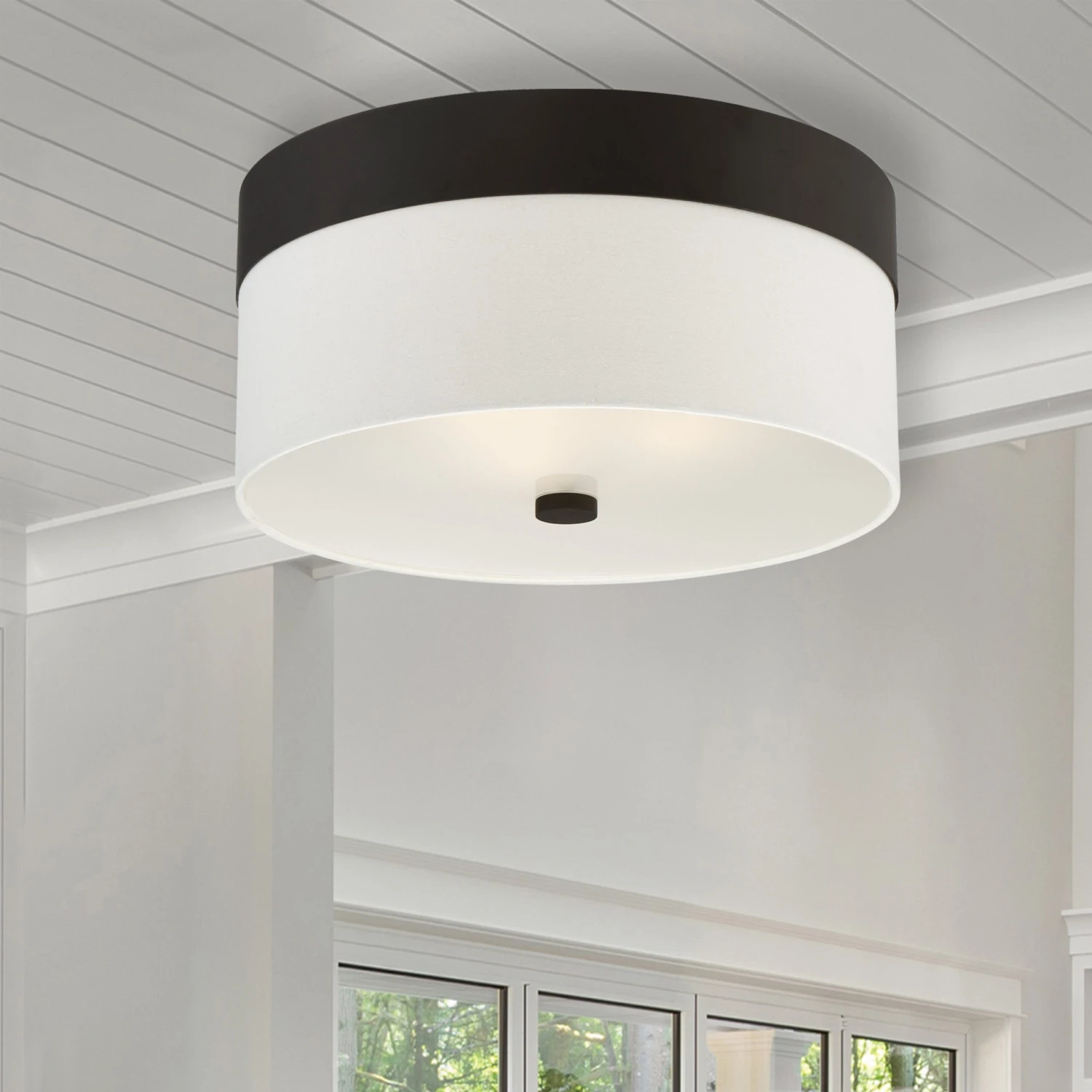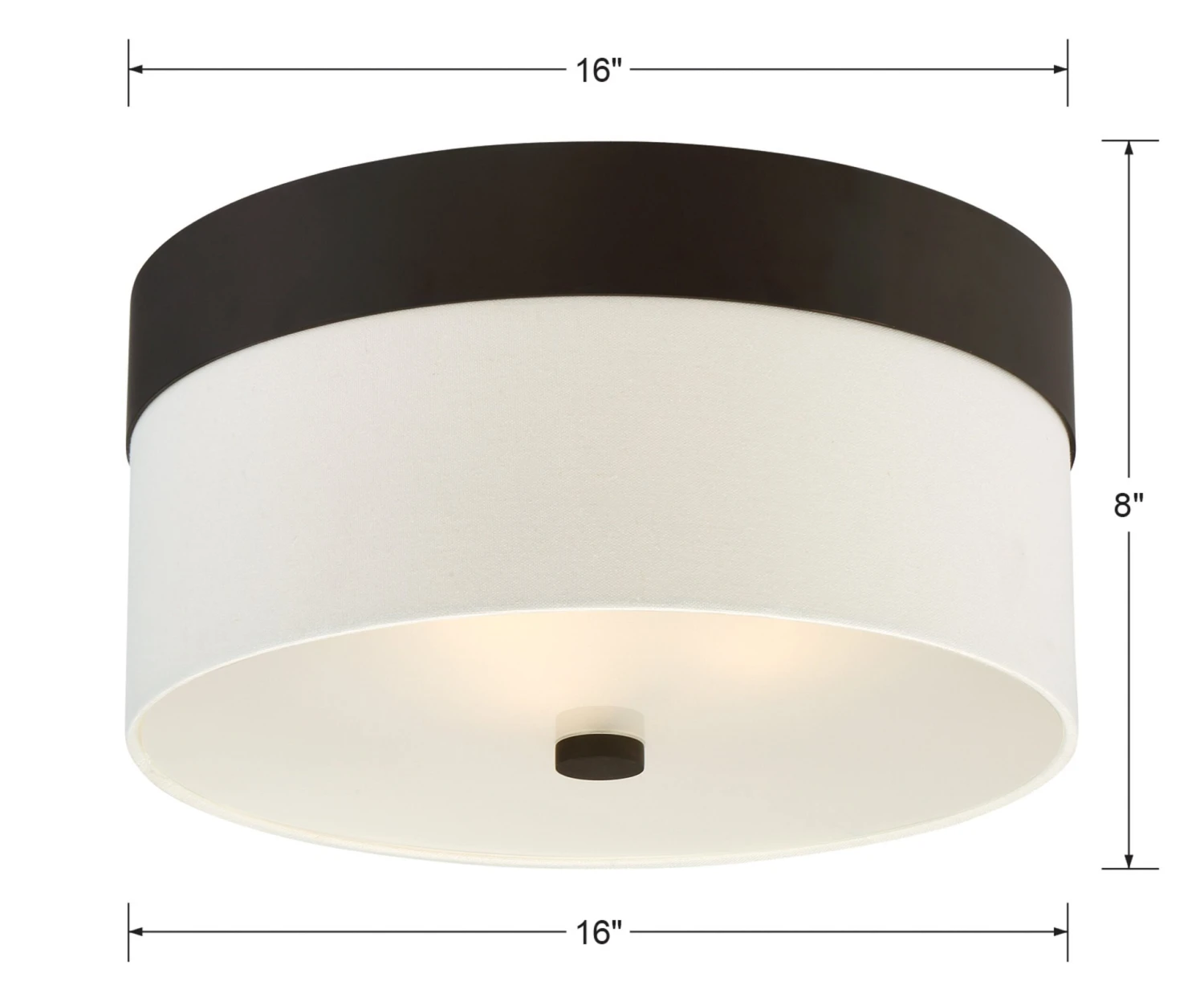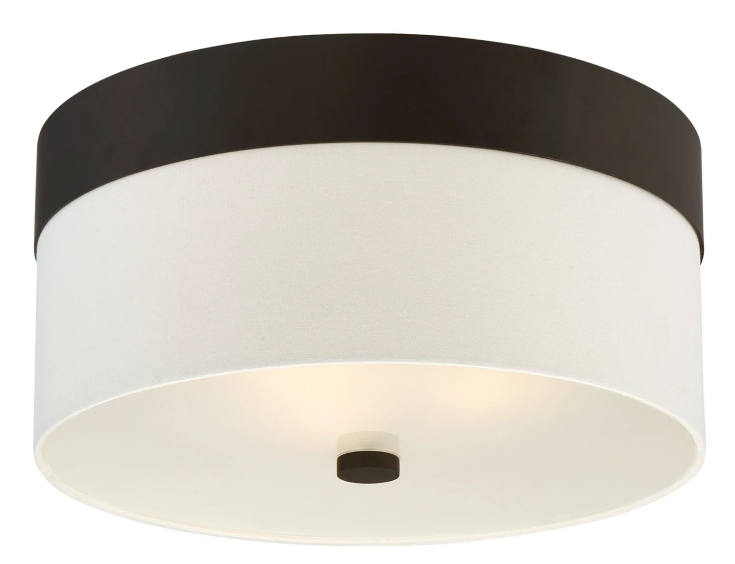 Ideally suited for illuminating a hallway or master bath, this cylindrical flush mount is set in a banded, bronze-finished frame with a matching finial and clean linen shade. Hardwired.