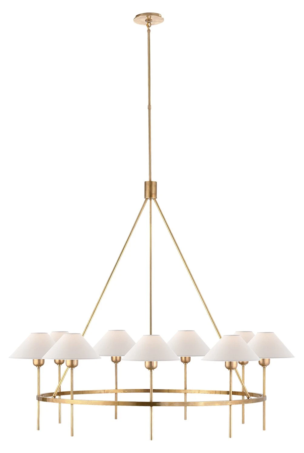 Designed by J. Randall Powers, the crisp, clean lines of this chandelier’s brass body and white paper shades are exceptionally pleasing to the eye. A hand-rubbed, antiqued brass finish completes the look. Hardwired.