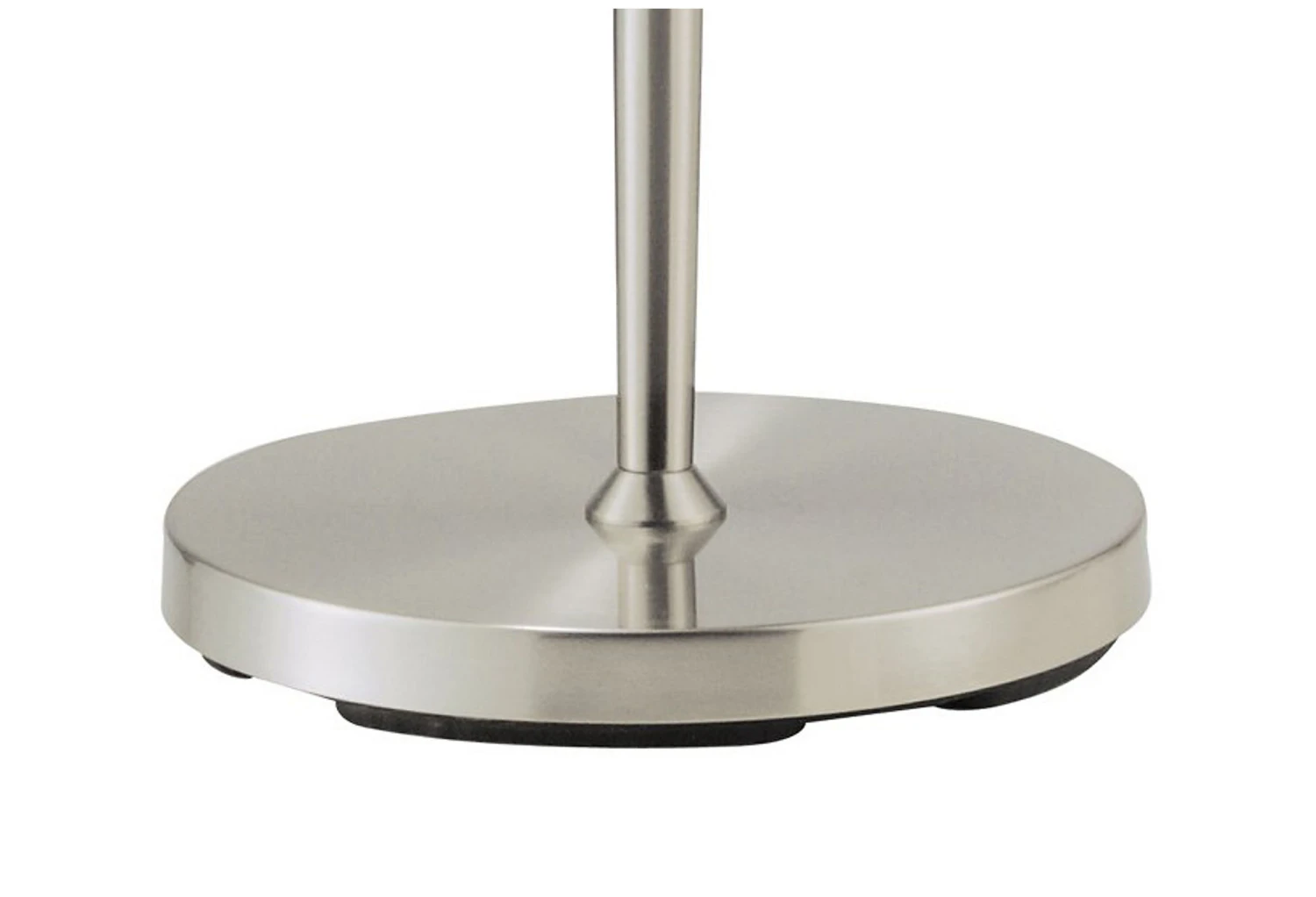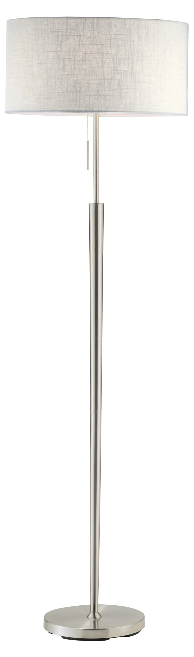 This floor lamp has a satin steel-finished body, a round base, and a white-textured fabric shade. A versatile style that will work well in any decor.