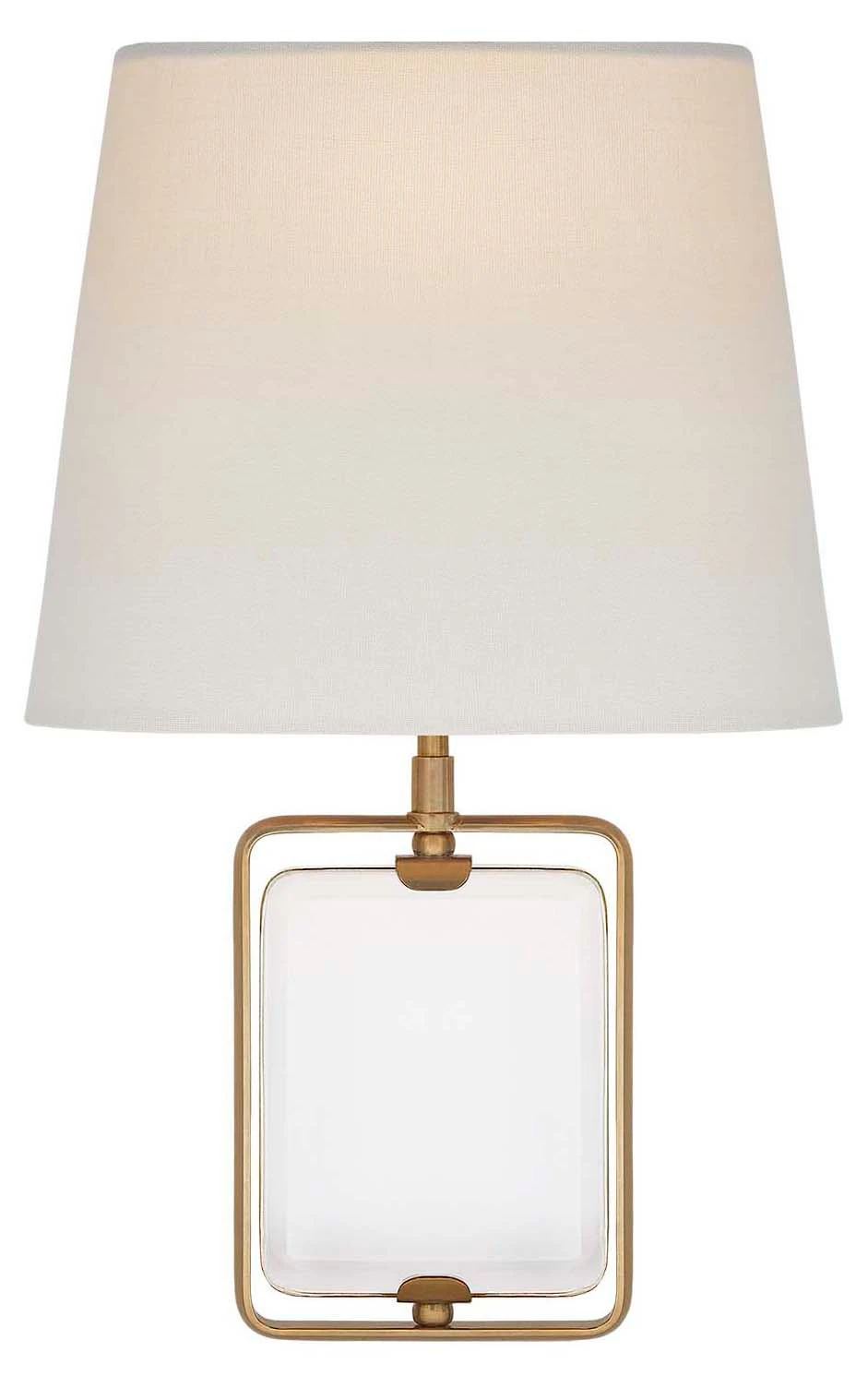 Framing a piece of clear crystal, this brass sconce from designer Suzanne Kasler is topped with a neutral linen shade. Hardwired.