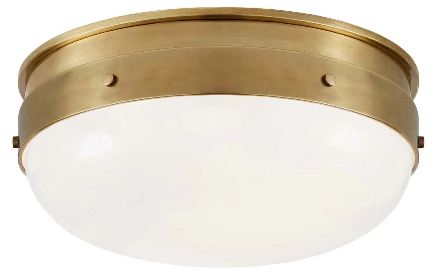 Crafted of hand-rubbed antiqued brass, this flush mount adds vintage inspiration to a room without overwhelming it. A great addition to an entryway, bathroom, or hallway, this piece is finished with a white glass shade. Hardwired.