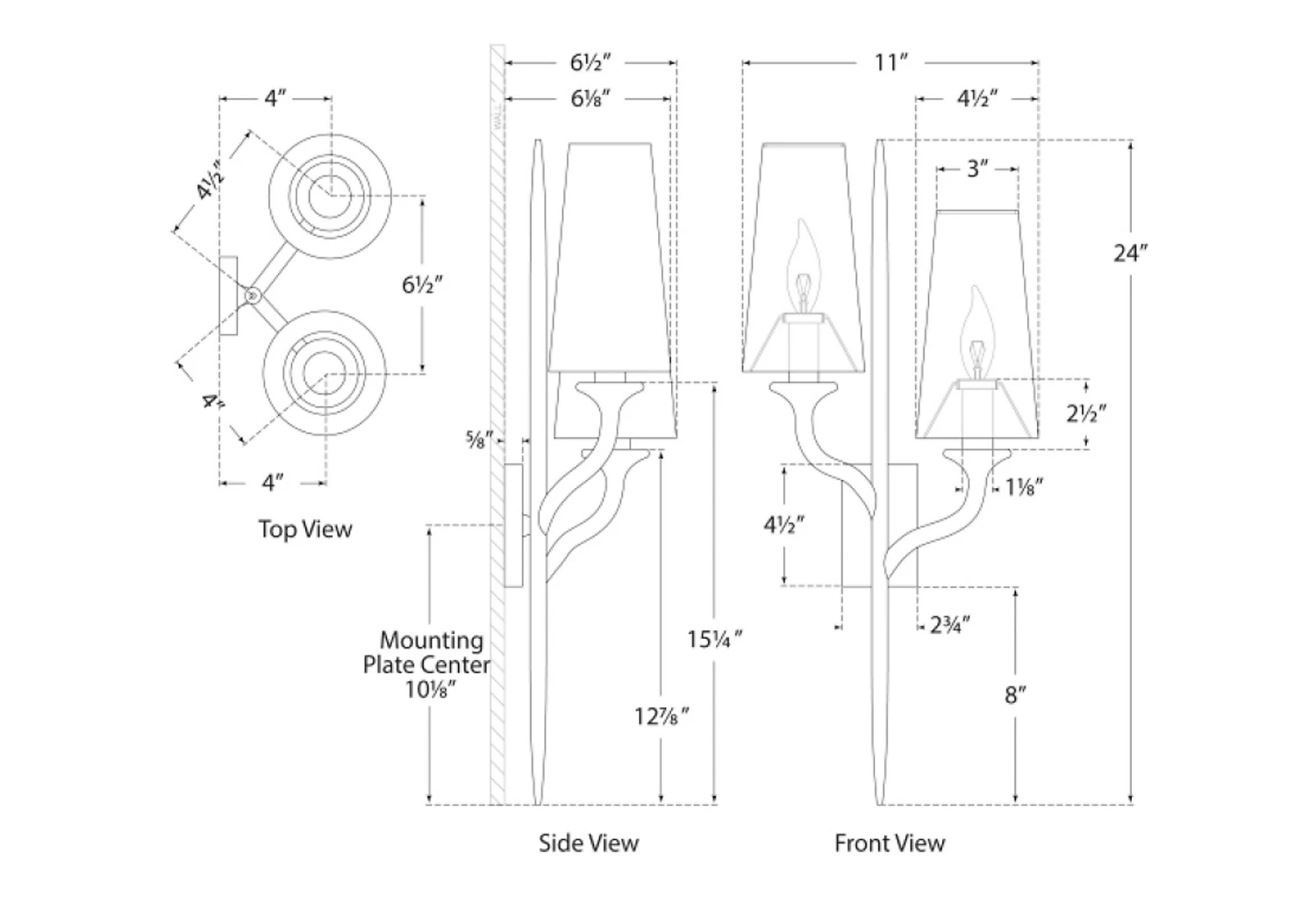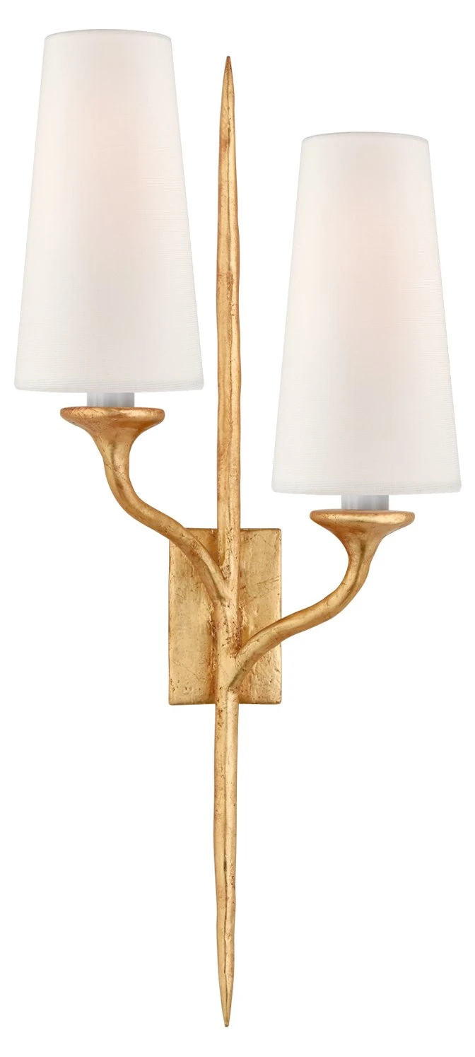 Designed by Julie Neill for Visual Comfort: This sconce is crafted of aluminum with branch-like detailing, an antiqued gold-leaf finish, and white linen shades. Hardwired.