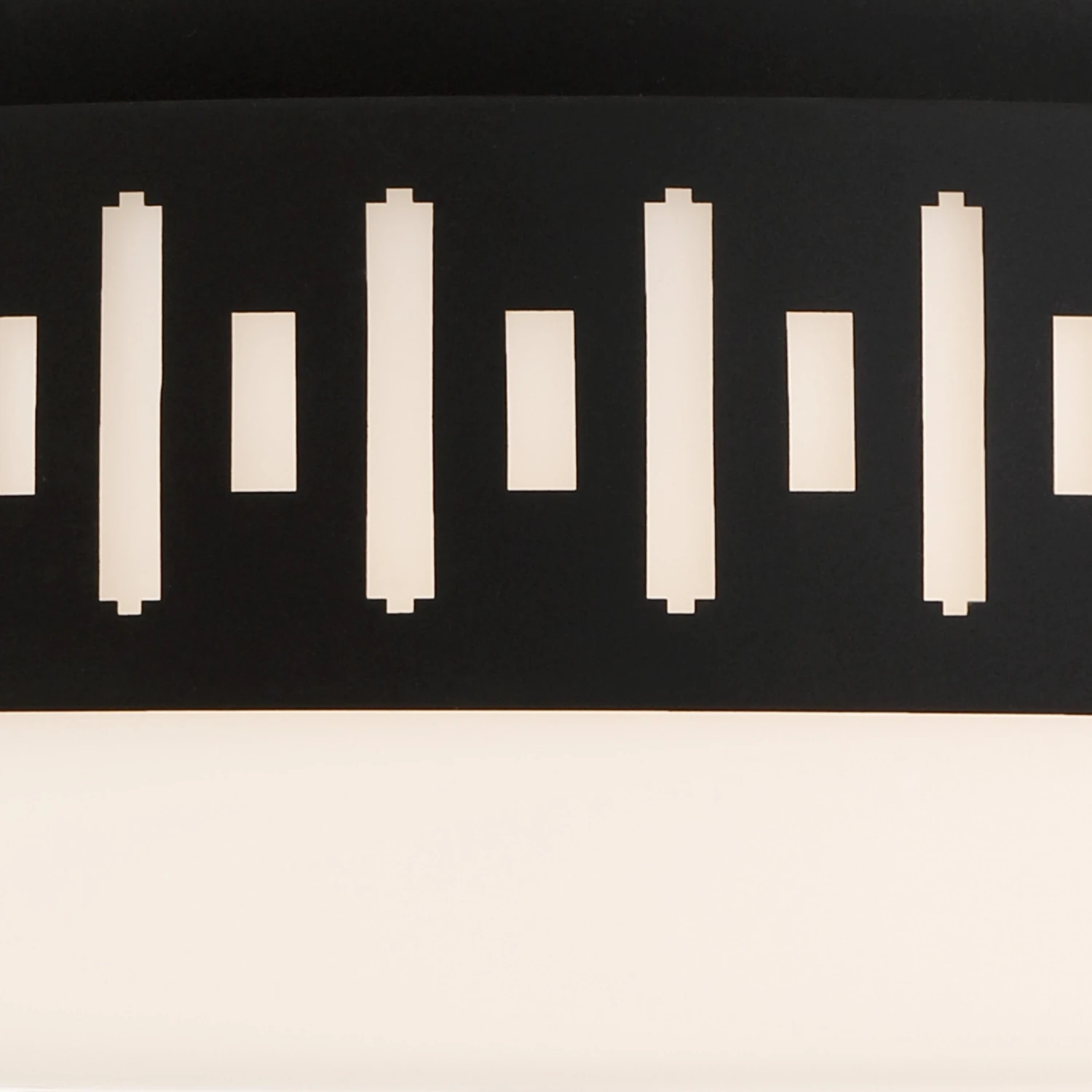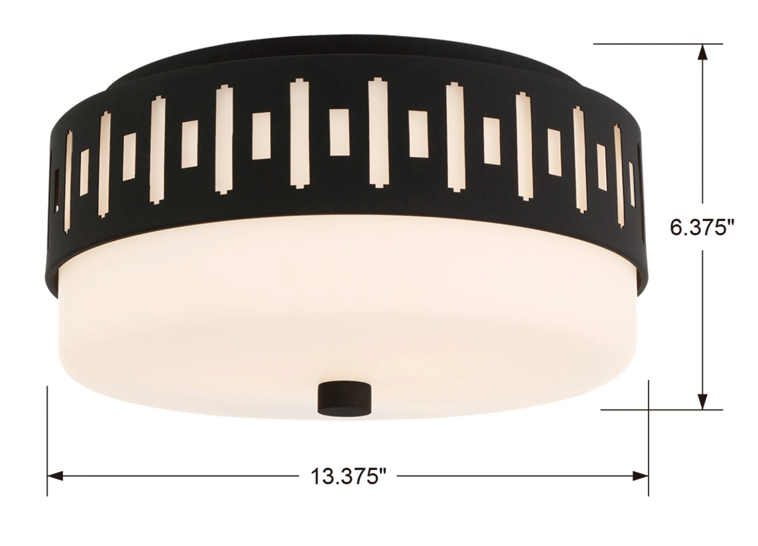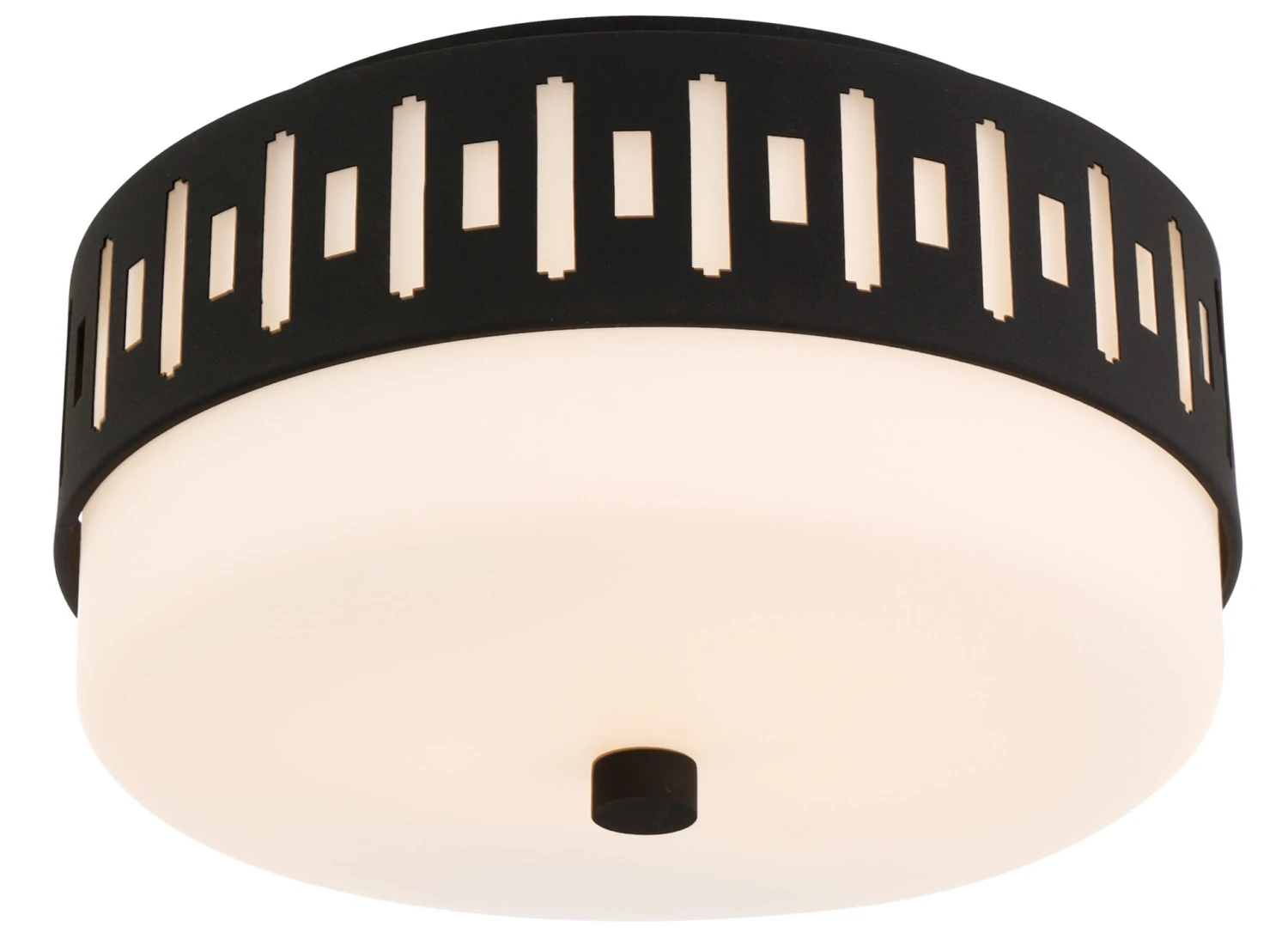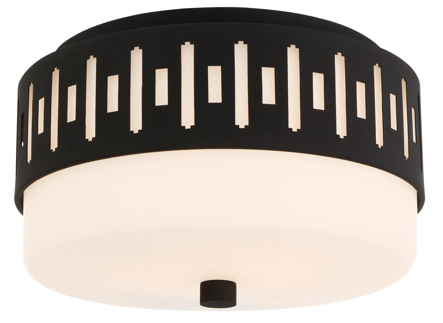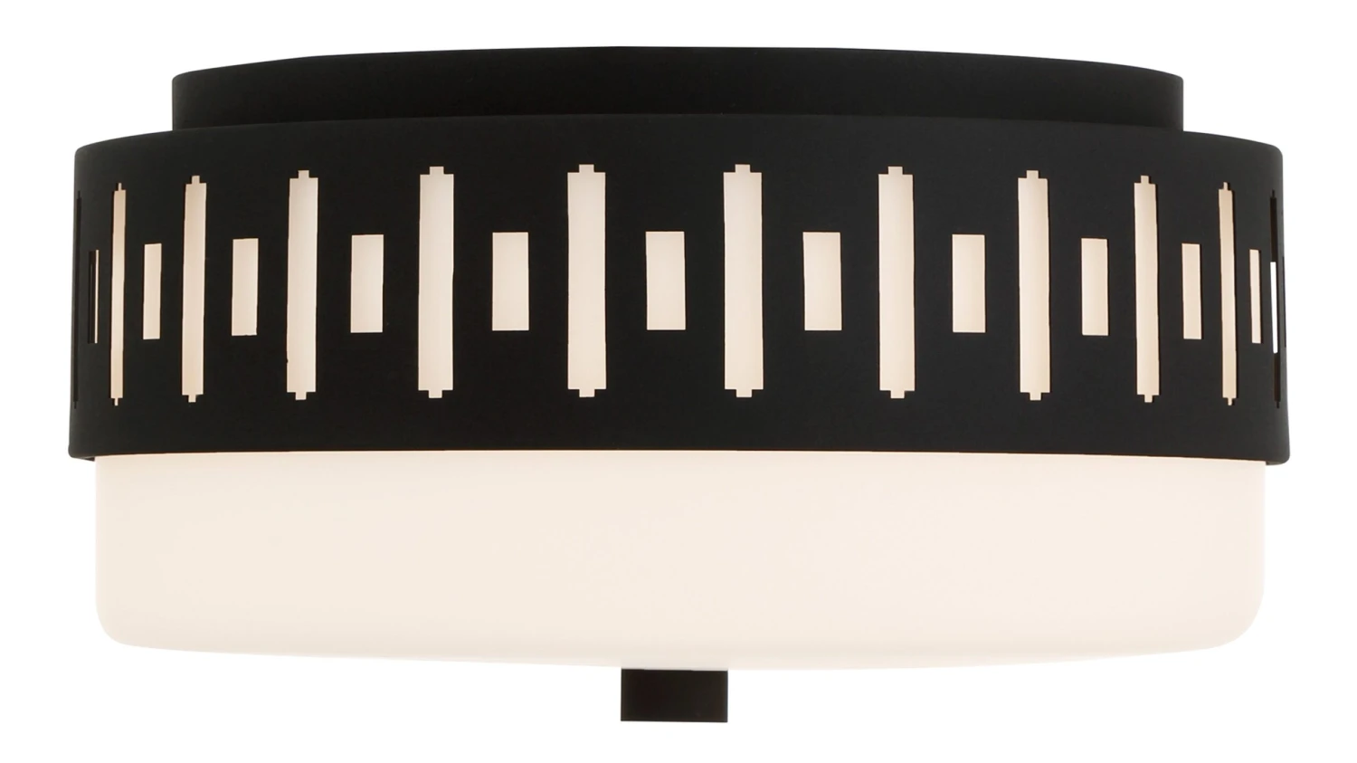 The rectangular cutouts along the black steel frame give this two-bulb ceiling mount a Craftsman-like appeal, especially in contrast to the white glass of the shade.