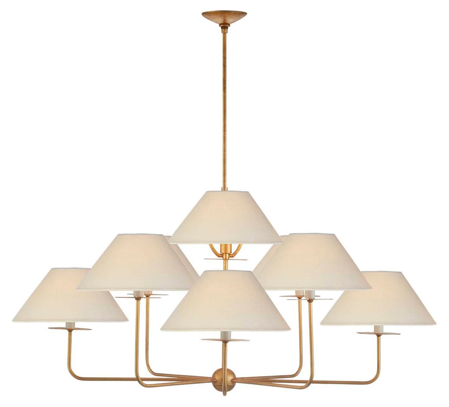 At home in a variety of decors, this chandelier from designer Niermann Weeks is crafted of iron with clean-lined, glided arms and neutral linen shades at off-setting heights. Hardwired.