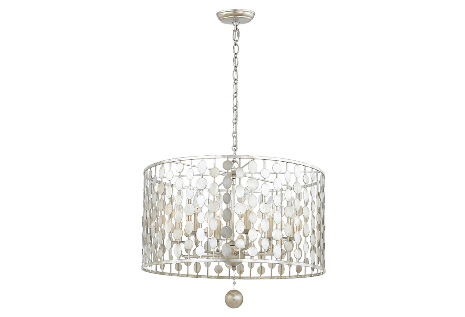 Strands of gleaming silver discs strung along a cylindrical frame give this chandelier a mid-century feel.