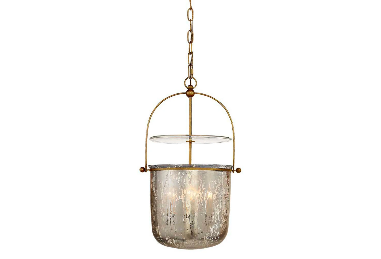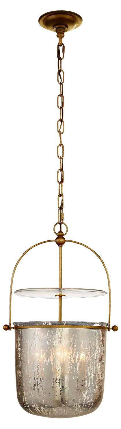 Visually striking, this E. F. Chapman design pairs gilded iron framework and a mercury glass shade that mirrors a matching disc suspended above. Hardwired.