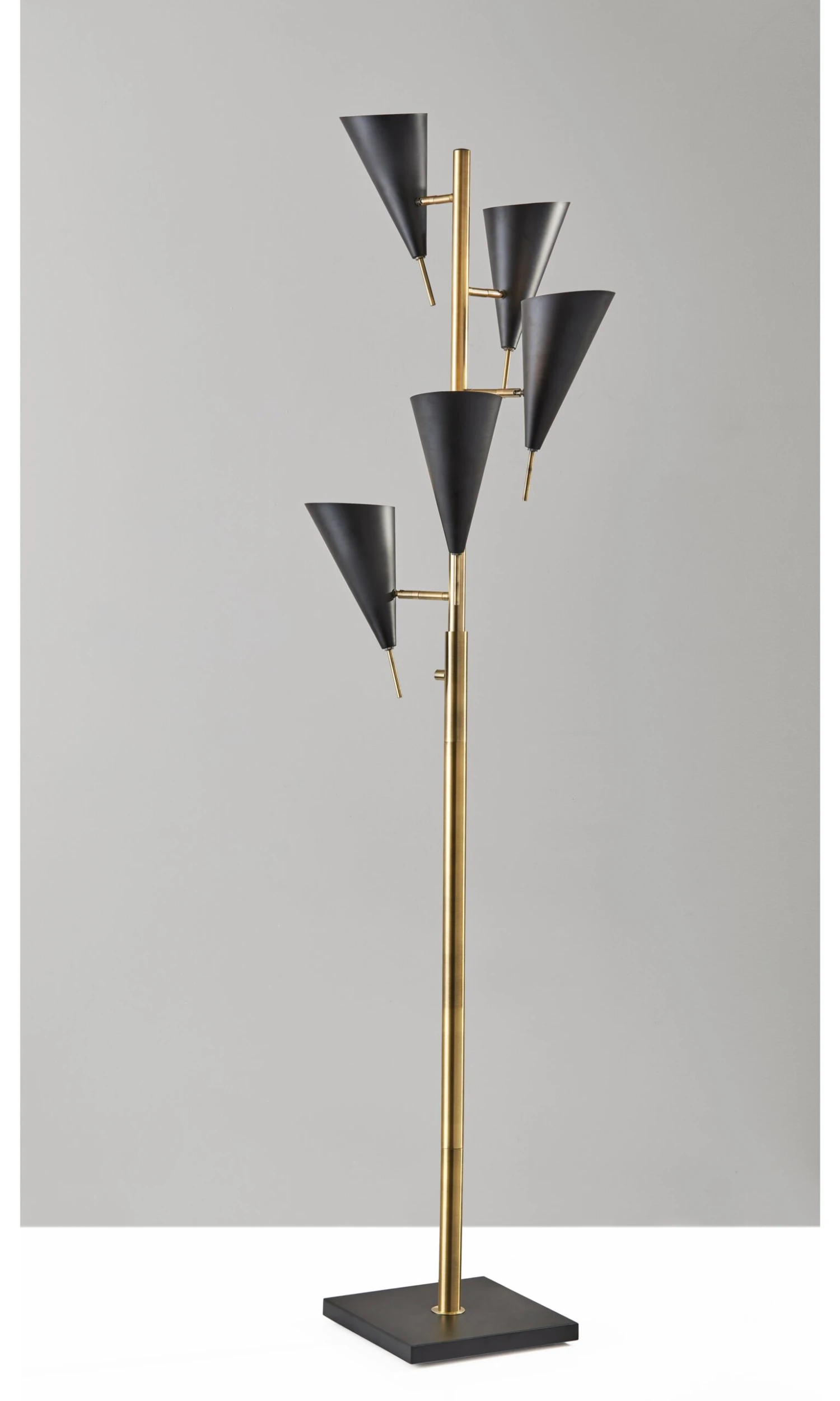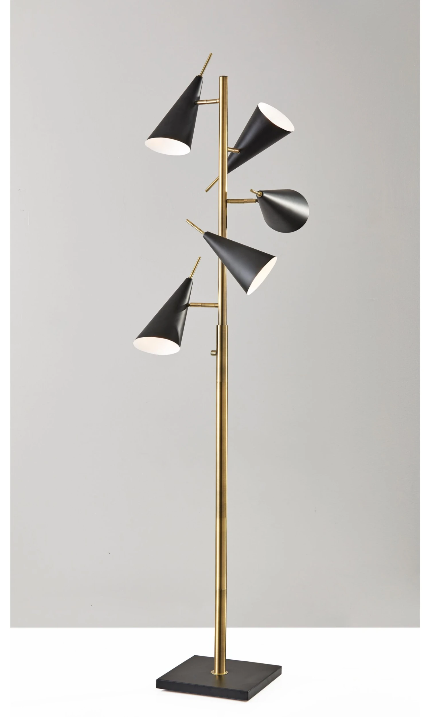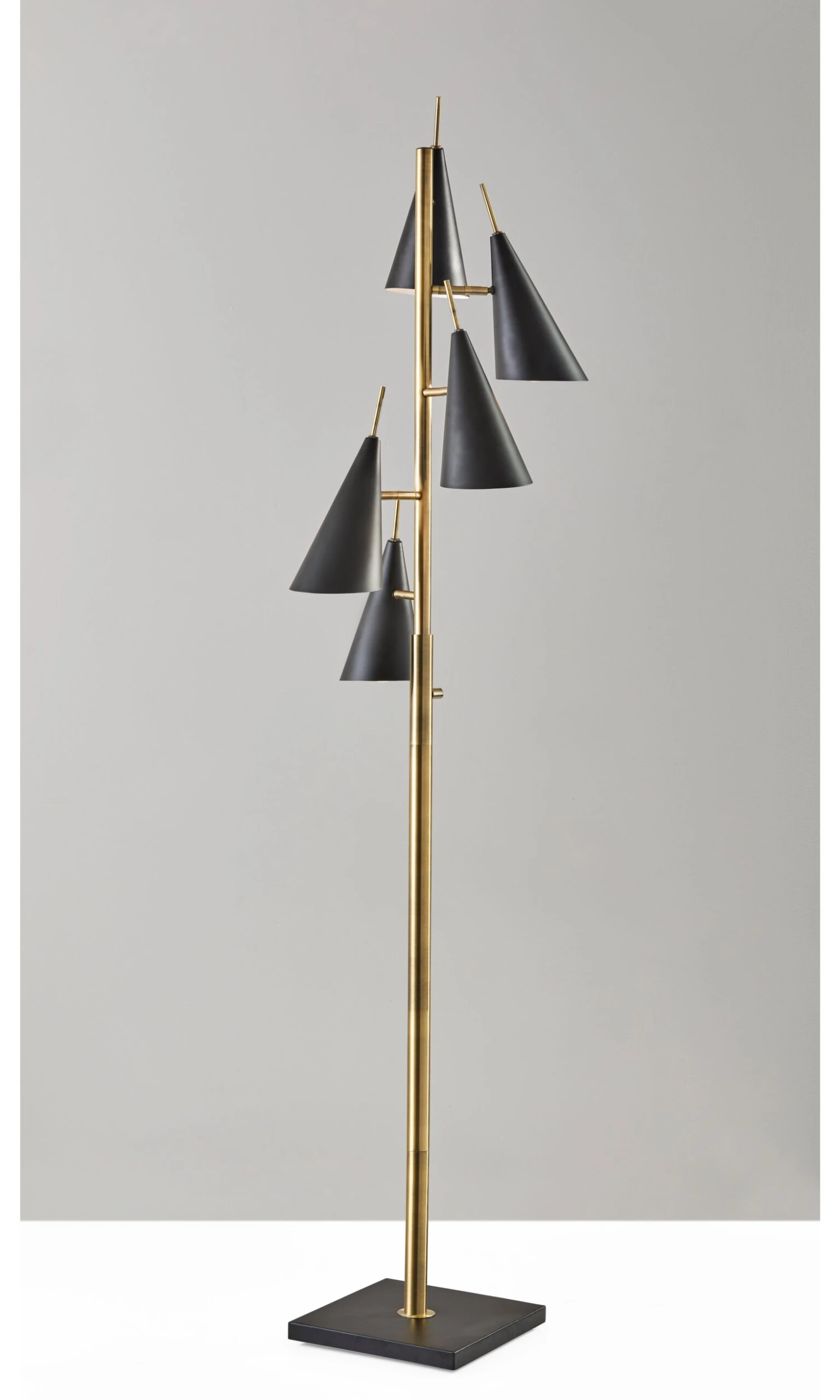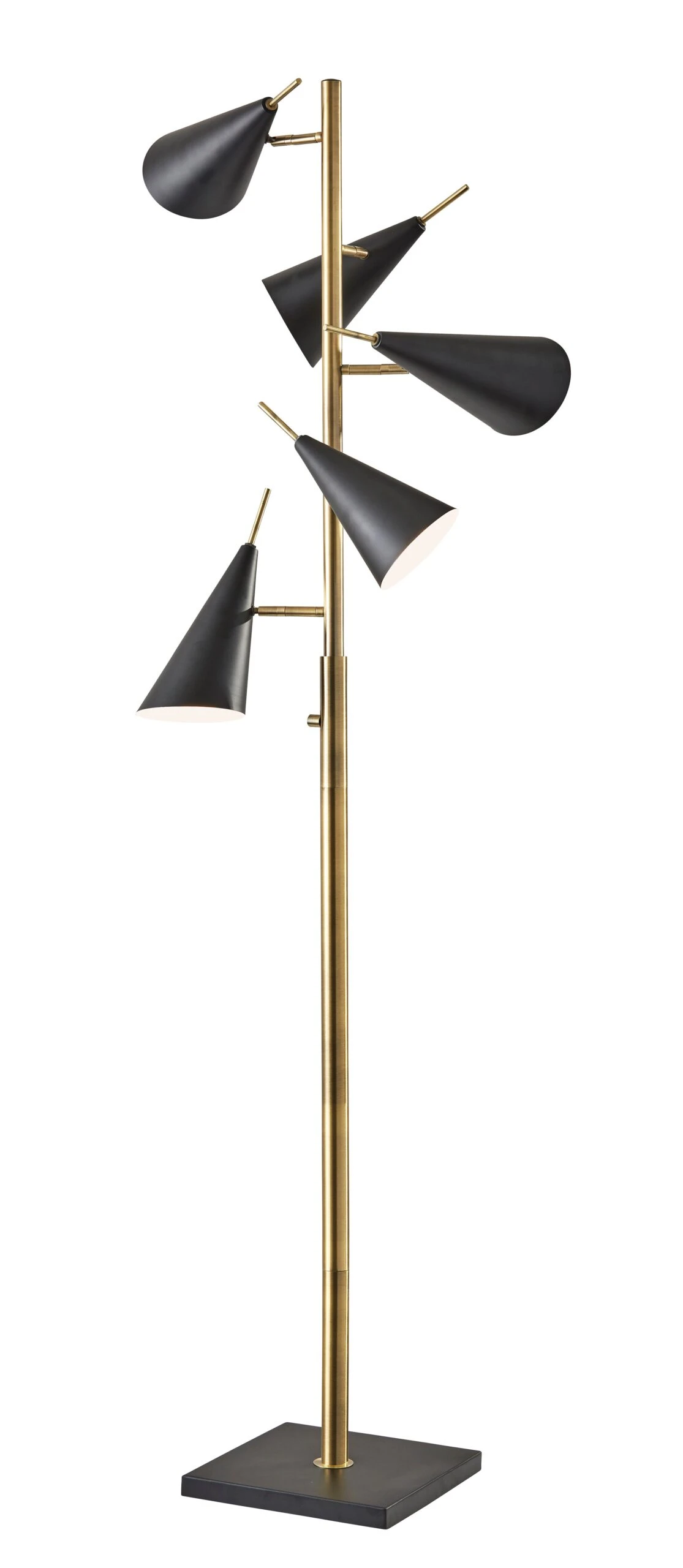 Inspired by vintage hollywood décor, the Lucas Table Lamp uses sharp angles and mid-century finishes to create a must-have retro-modern style. With five adjustable task shades, this lamp can work in various areas of the home. Place this lamp next to your desk to illuminate your workspace or in the living room corner for room-filling ambient lighting. An easily accessible brass on/off rotary switch is located on the lamp base. A rotary switch on the pole adjusts the light at four settings: 2 lights on, 3 lights on, all lights on, off.