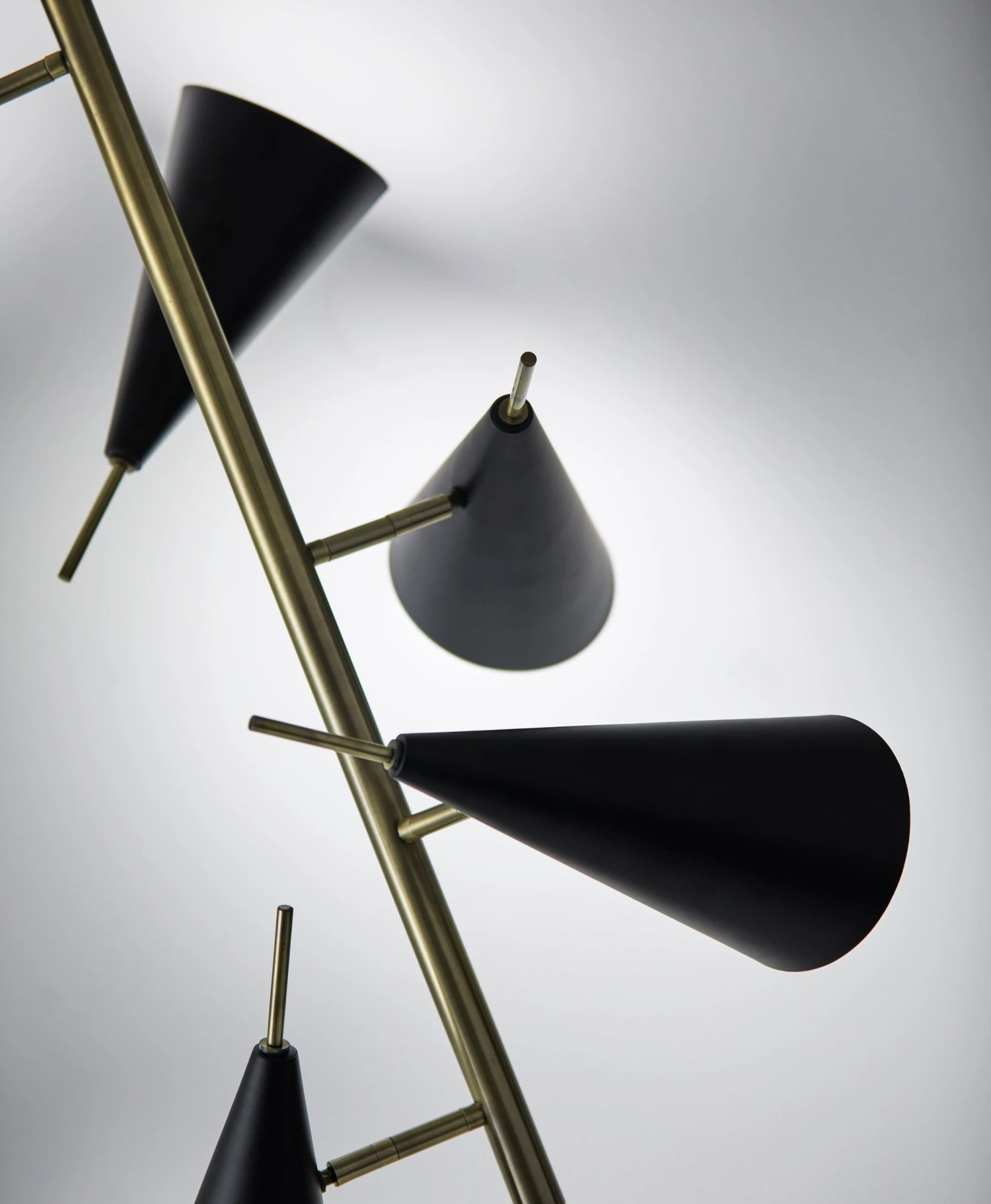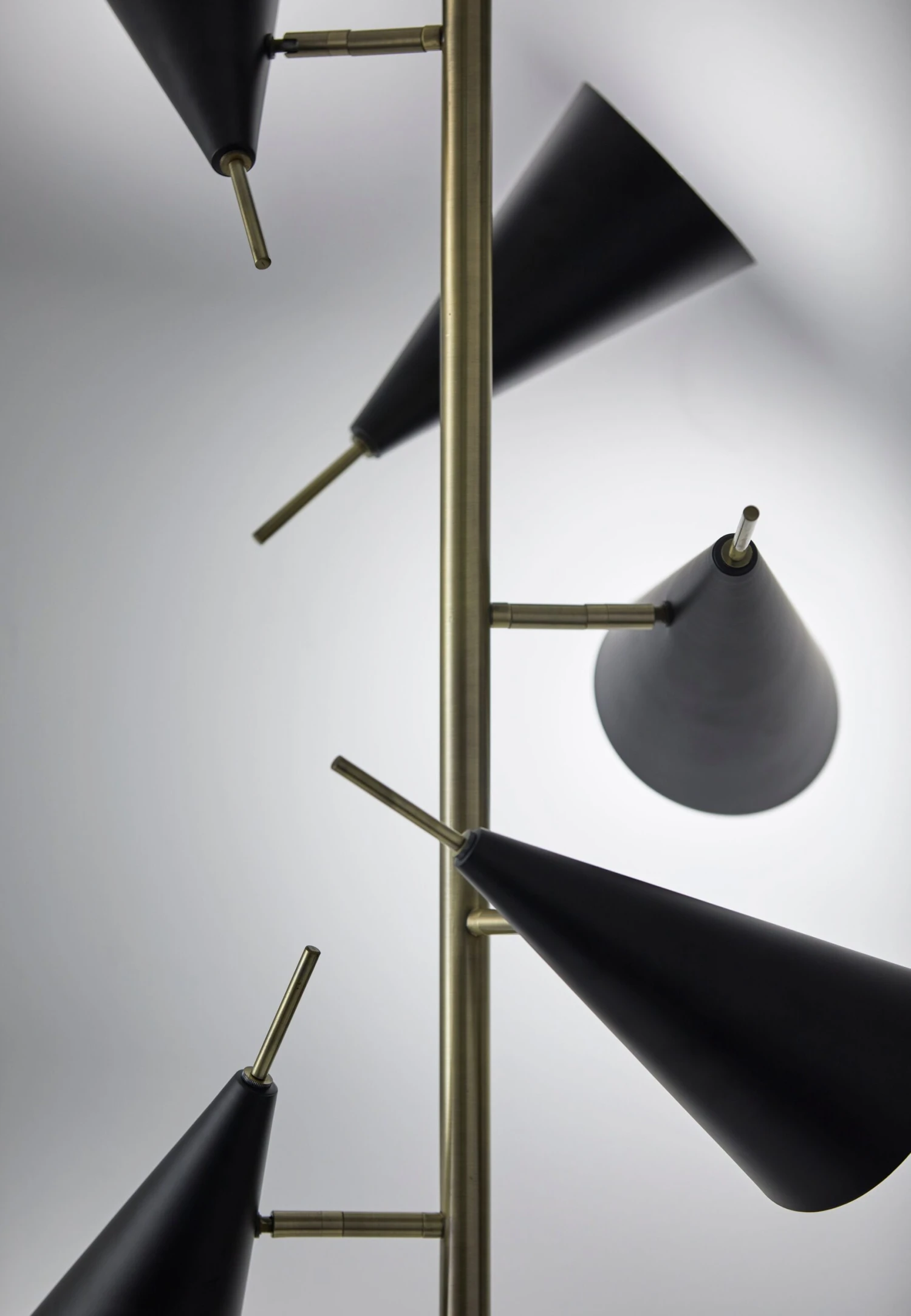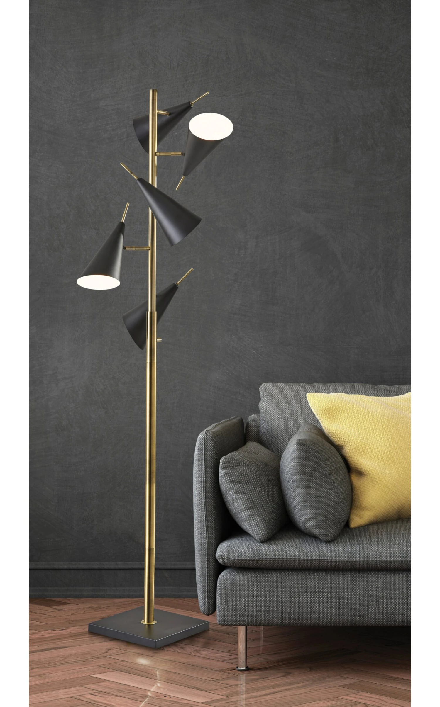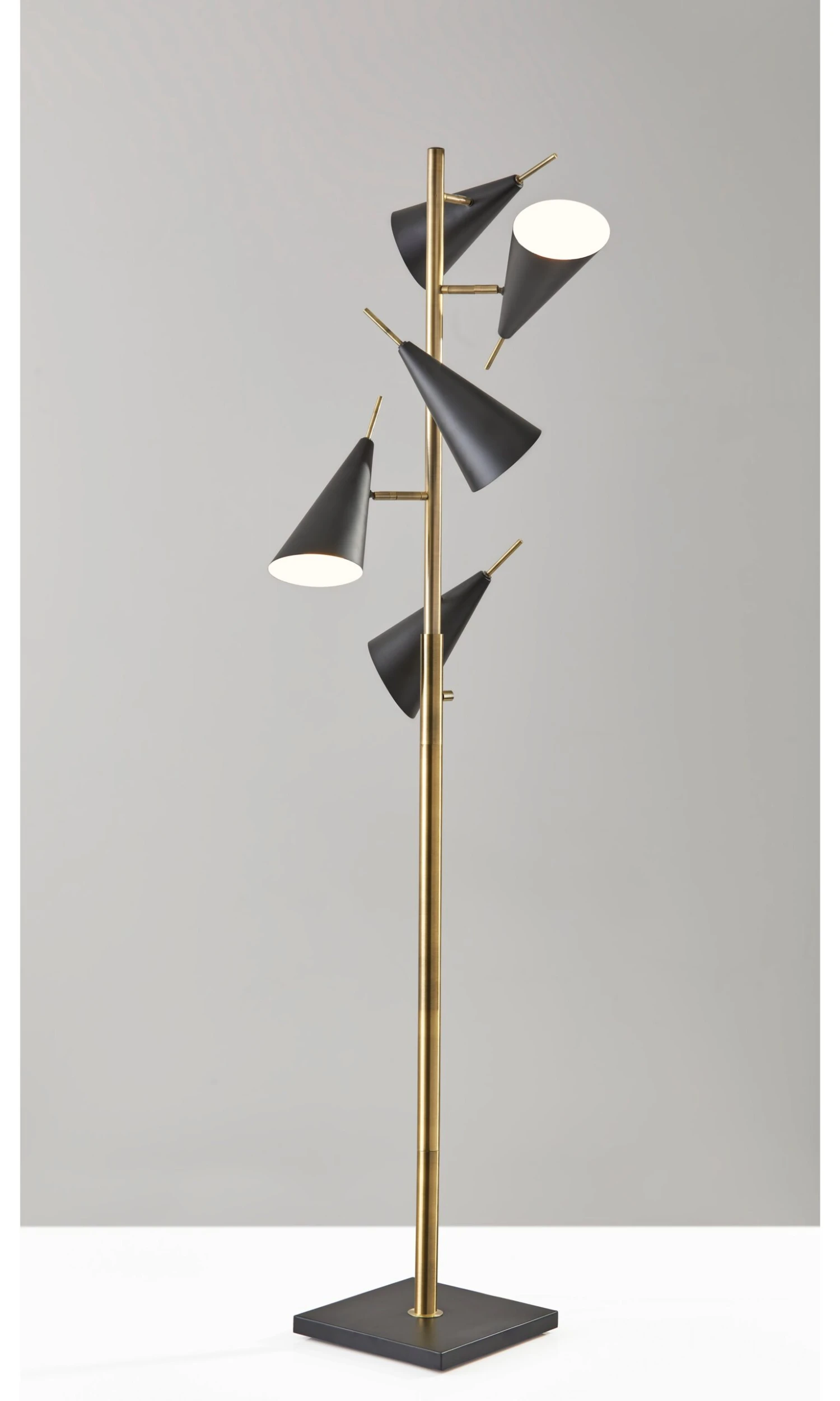Inspired by vintage hollywood décor, the Lucas Table Lamp uses sharp angles and mid-century finishes to create a must-have retro-modern style. With five adjustable task shades, this lamp can work in various areas of the home. Place this lamp next to your desk to illuminate your workspace or in the living room corner for room-filling ambient lighting. An easily accessible brass on/off rotary switch is located on the lamp base. A rotary switch on the pole adjusts the light at four settings: 2 lights on, 3 lights on, all lights on, off.