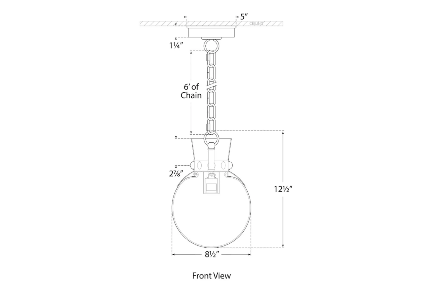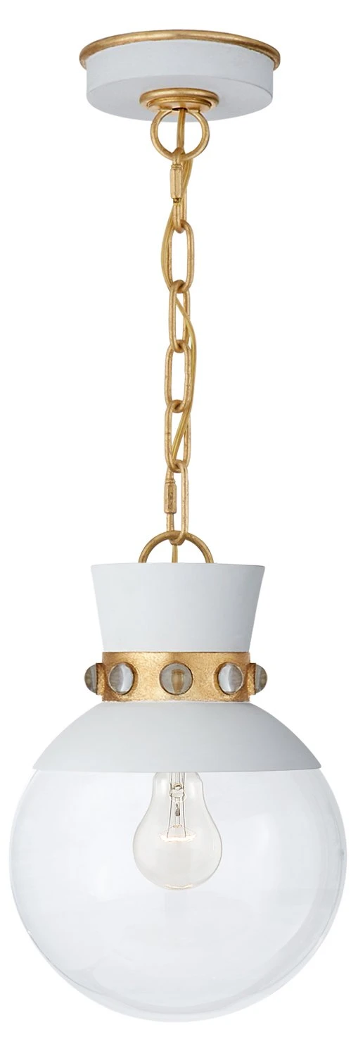 Designed by Julie Neill for Visual Comfort: Like jewelry for the room, this pendant is crafted of steel with a matte white finish and accented with a studded golden band and clear glass globe shade. Hardwired.