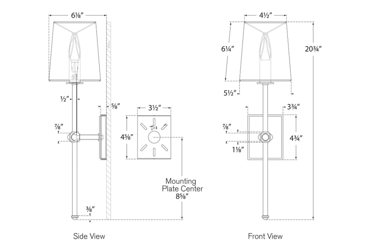 Designed by Julie Neill for Visual Comfort: Mounted on a rectangular backplate, this sconce features an exaggerated rod crafted of clear crystal and steel with a matte black finish and golden accents. A white linen shade completes this design. Hardwired.