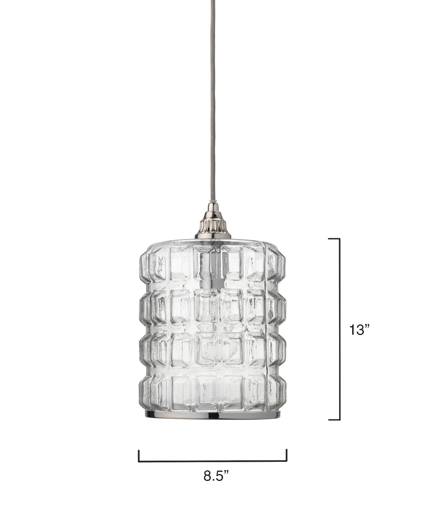The raised block-grid details of this pendant’s clear glass shade give it eye-catching dimension and an unexpected sense of texture. Polished nickel accents complete the design. Hardwired.