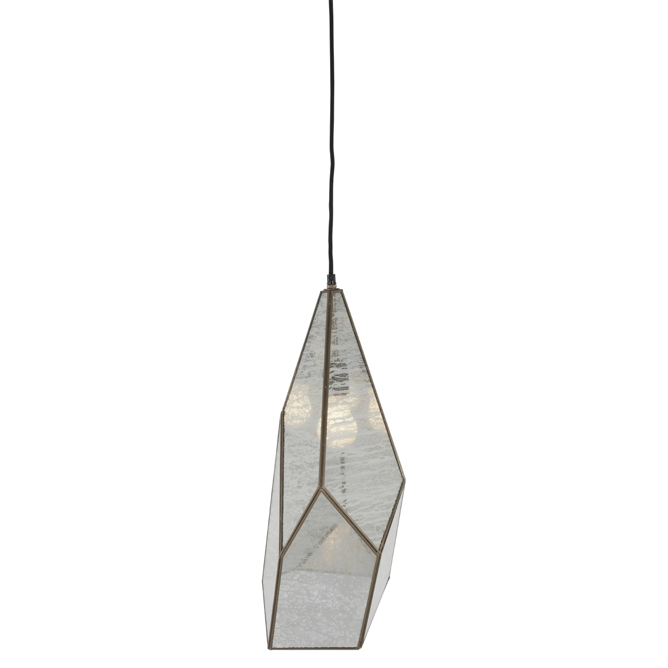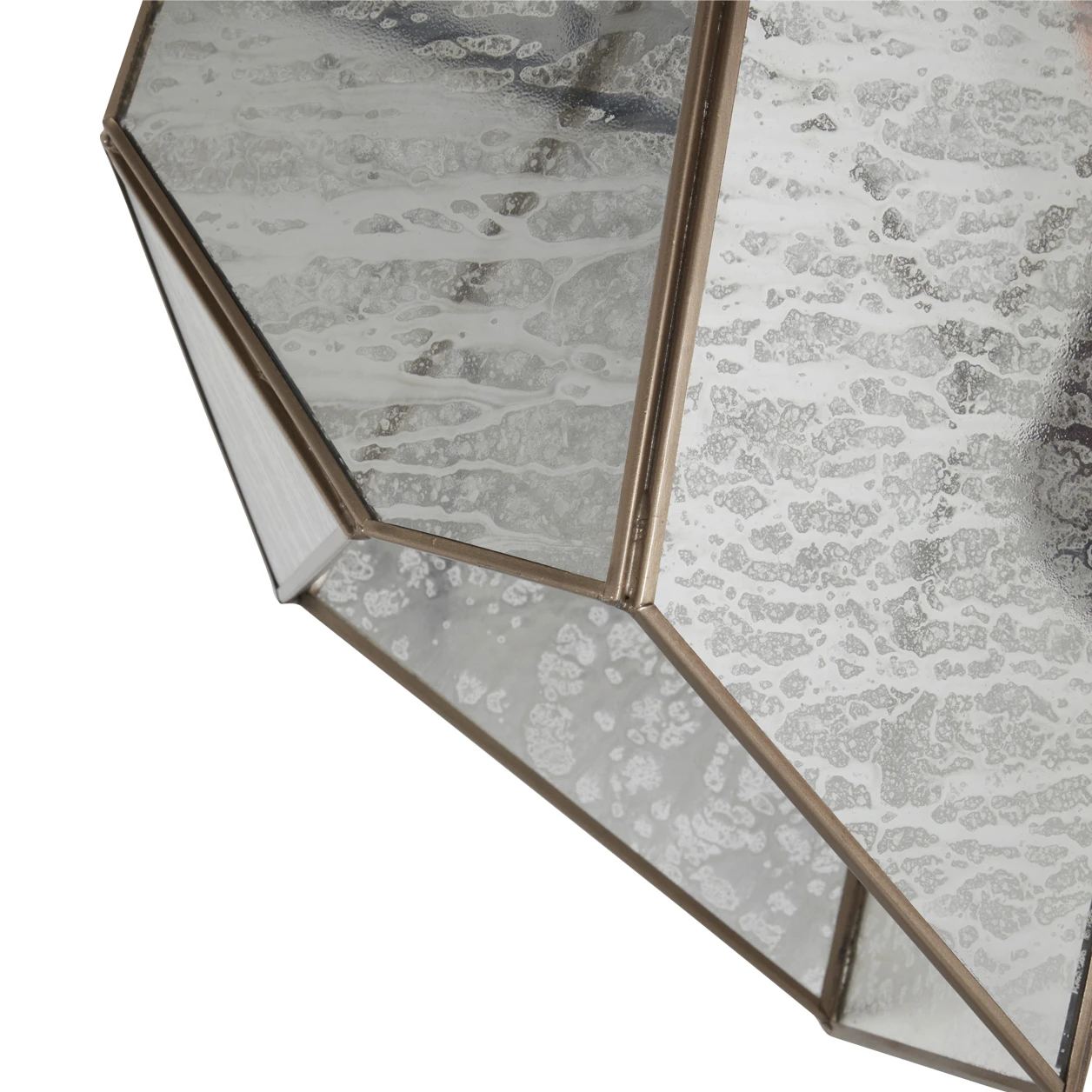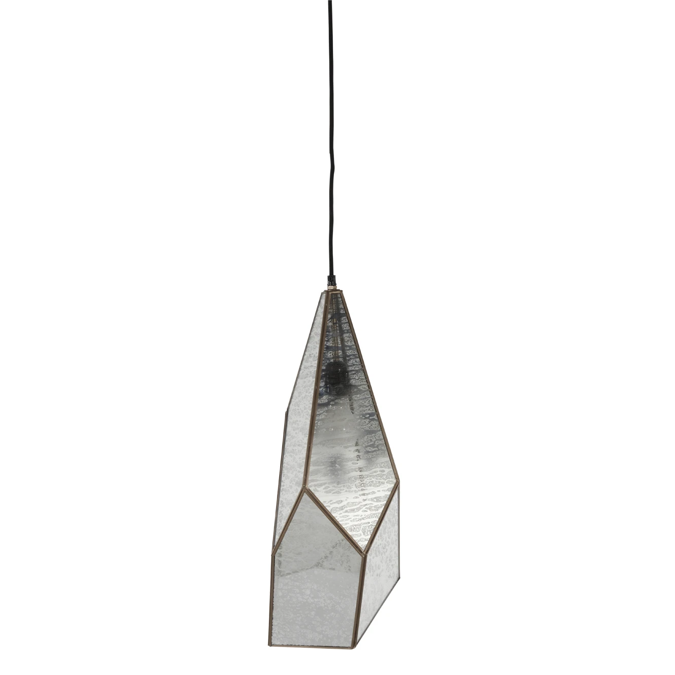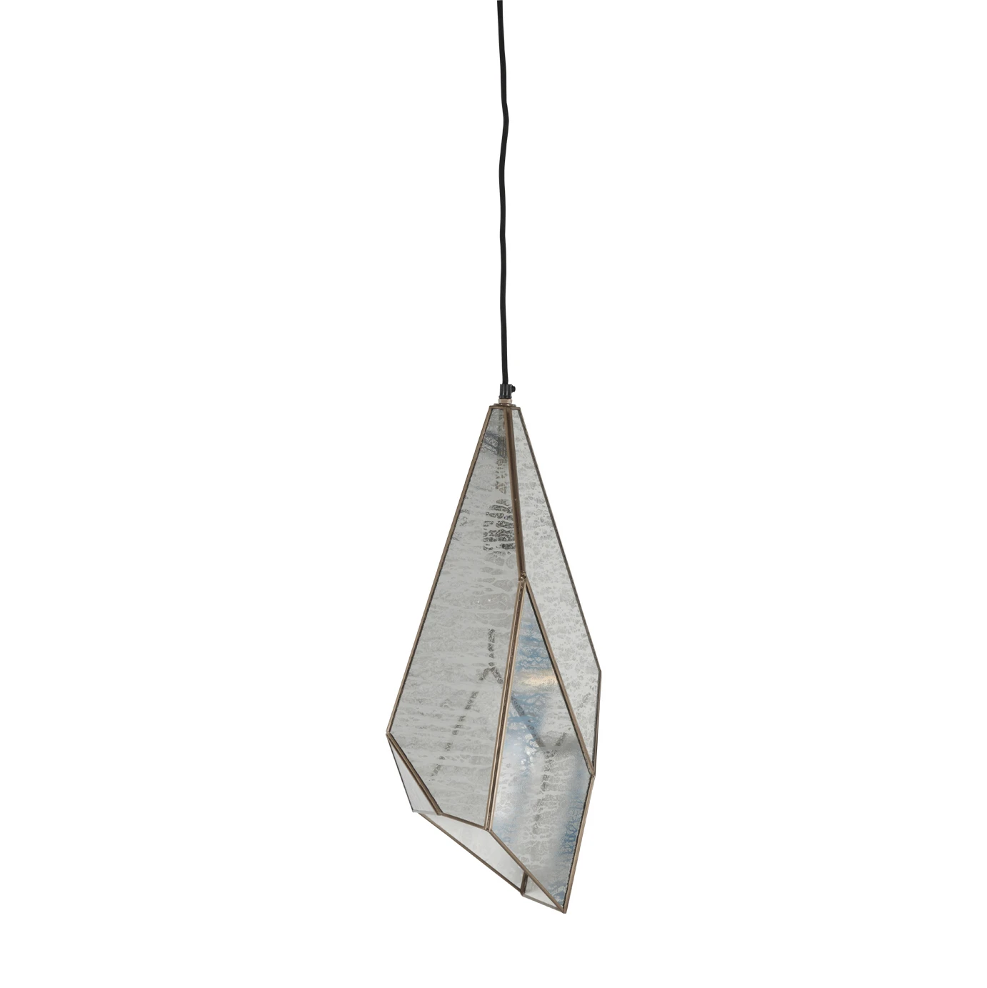 Panels of mercury glass are set within a faceted brushed-brass frame, giving this lighting pendant a jewellike glamour. When the light is on, the glass takes on a flattering glow that accentuates its artisanal texture.