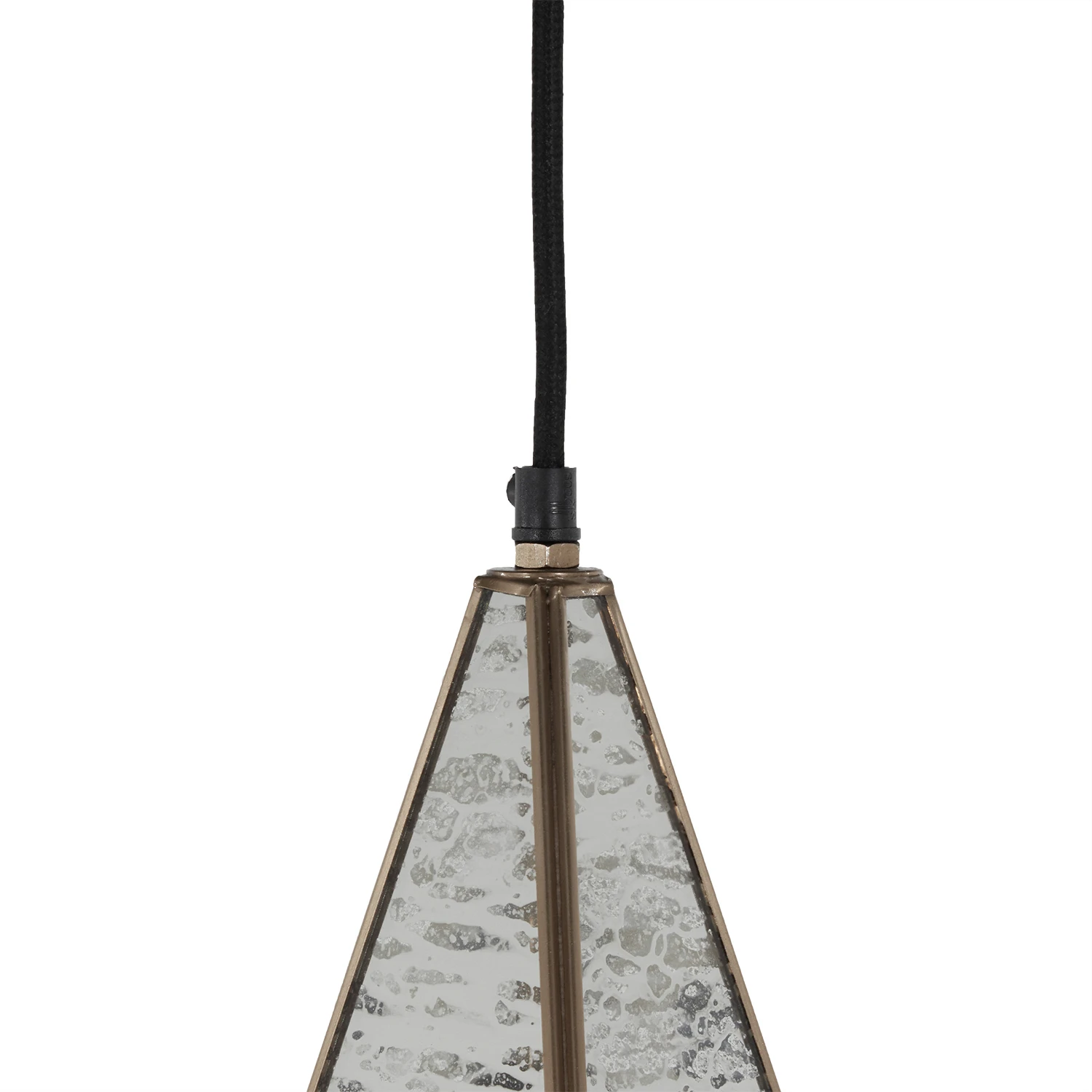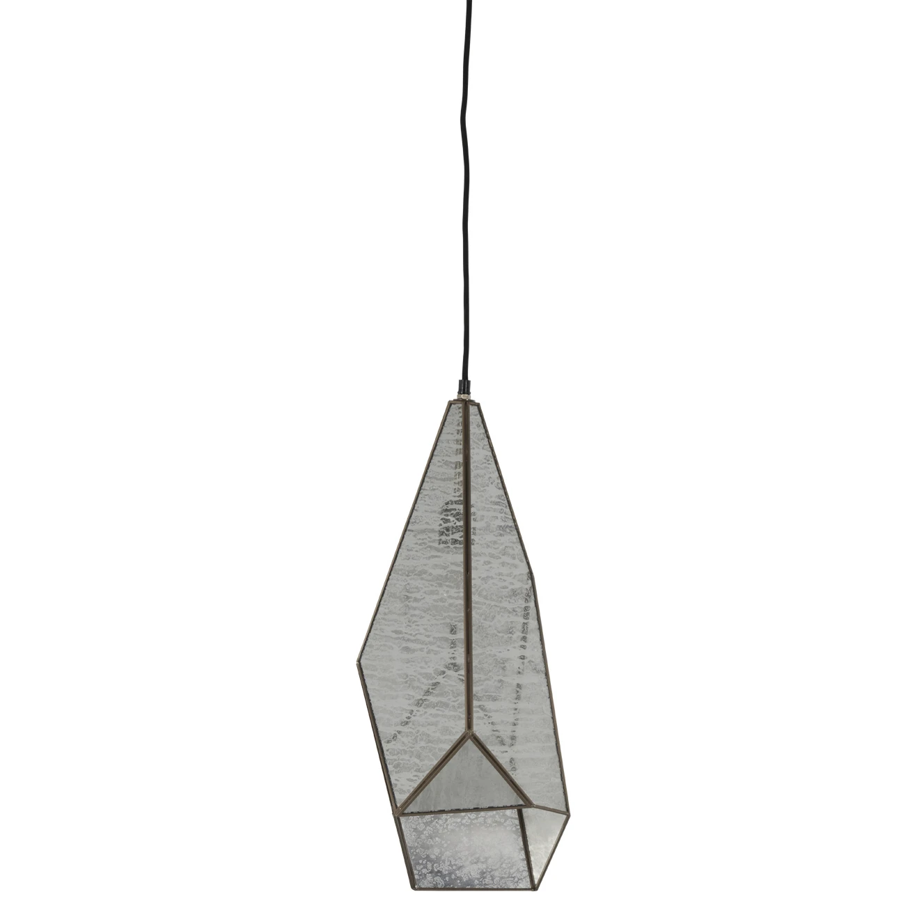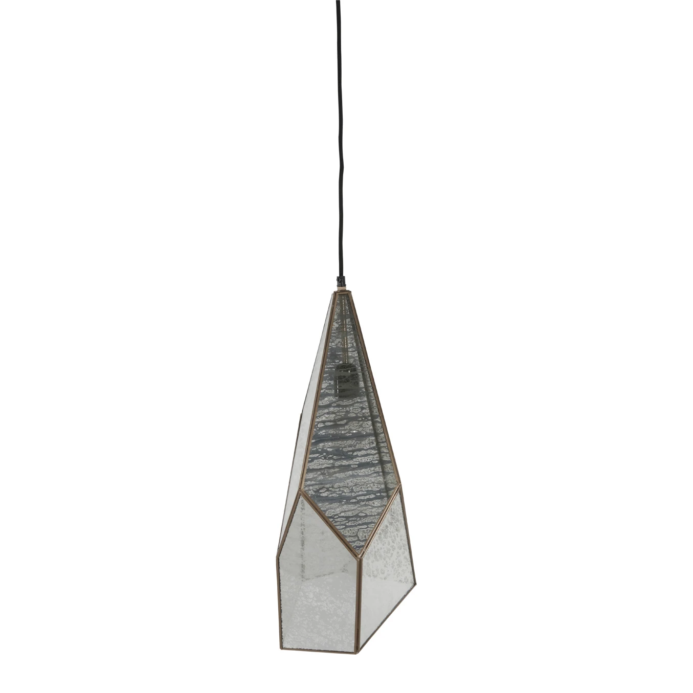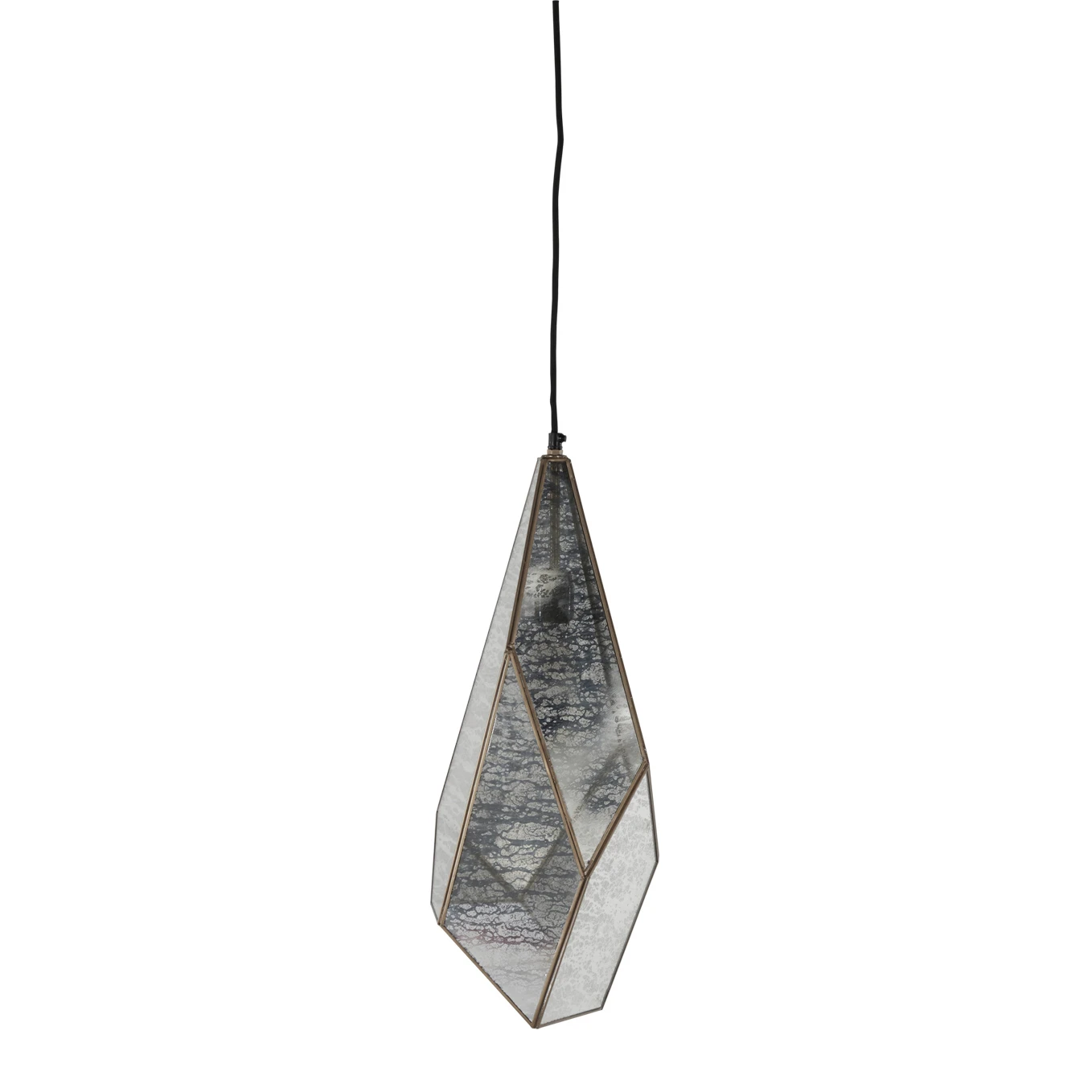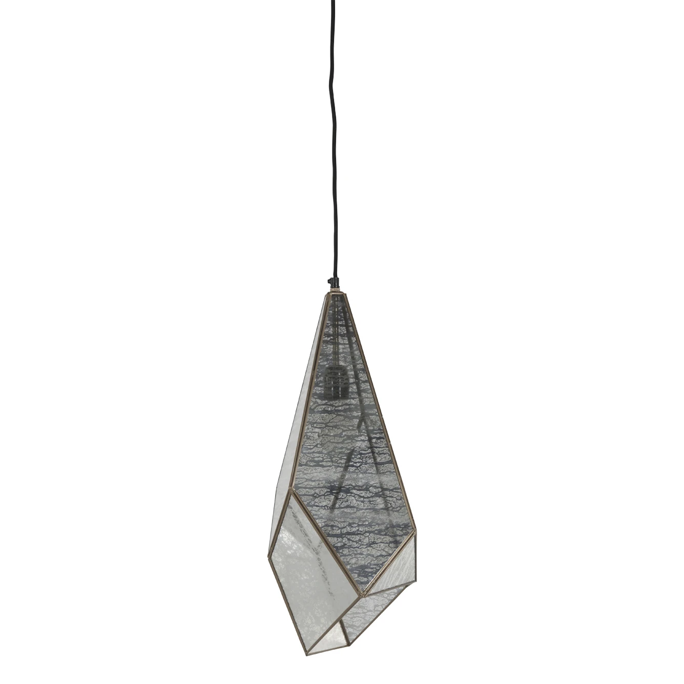 Panels of mercury glass are set within a faceted brushed-brass frame, giving this lighting pendant a jewellike glamour. When the light is on, the glass takes on a flattering glow that accentuates its artisanal texture.
