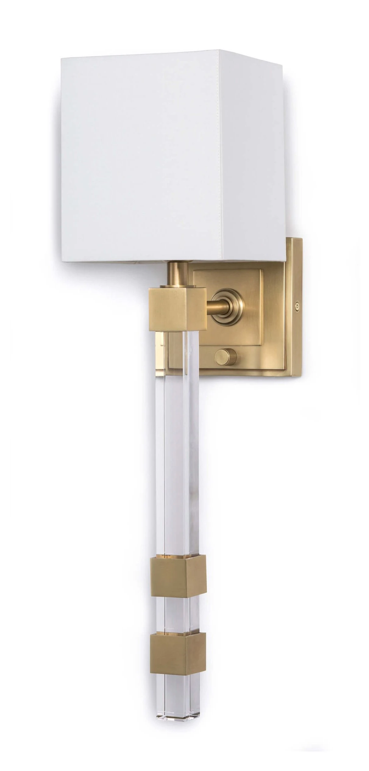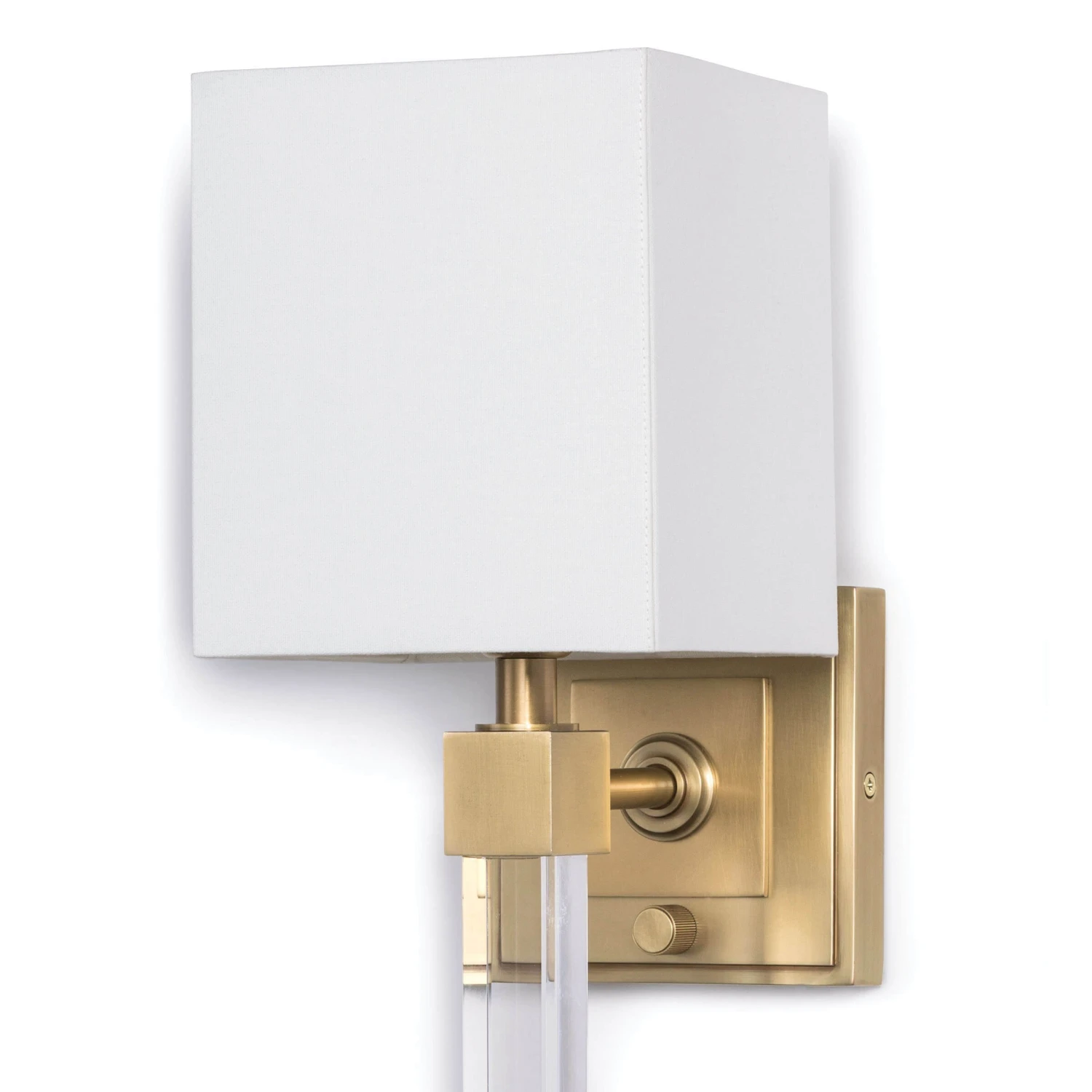 Gleaming in brass-finished steel and cut crystal, this modern sconce makes an immediate impression in any space. A boxy linen shade adds clean contrast. Hardwired.