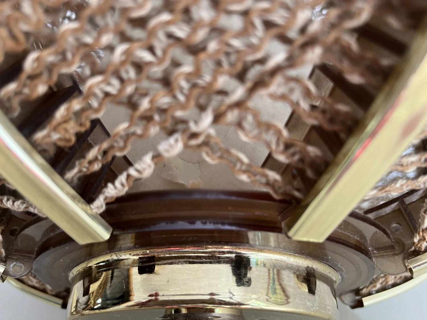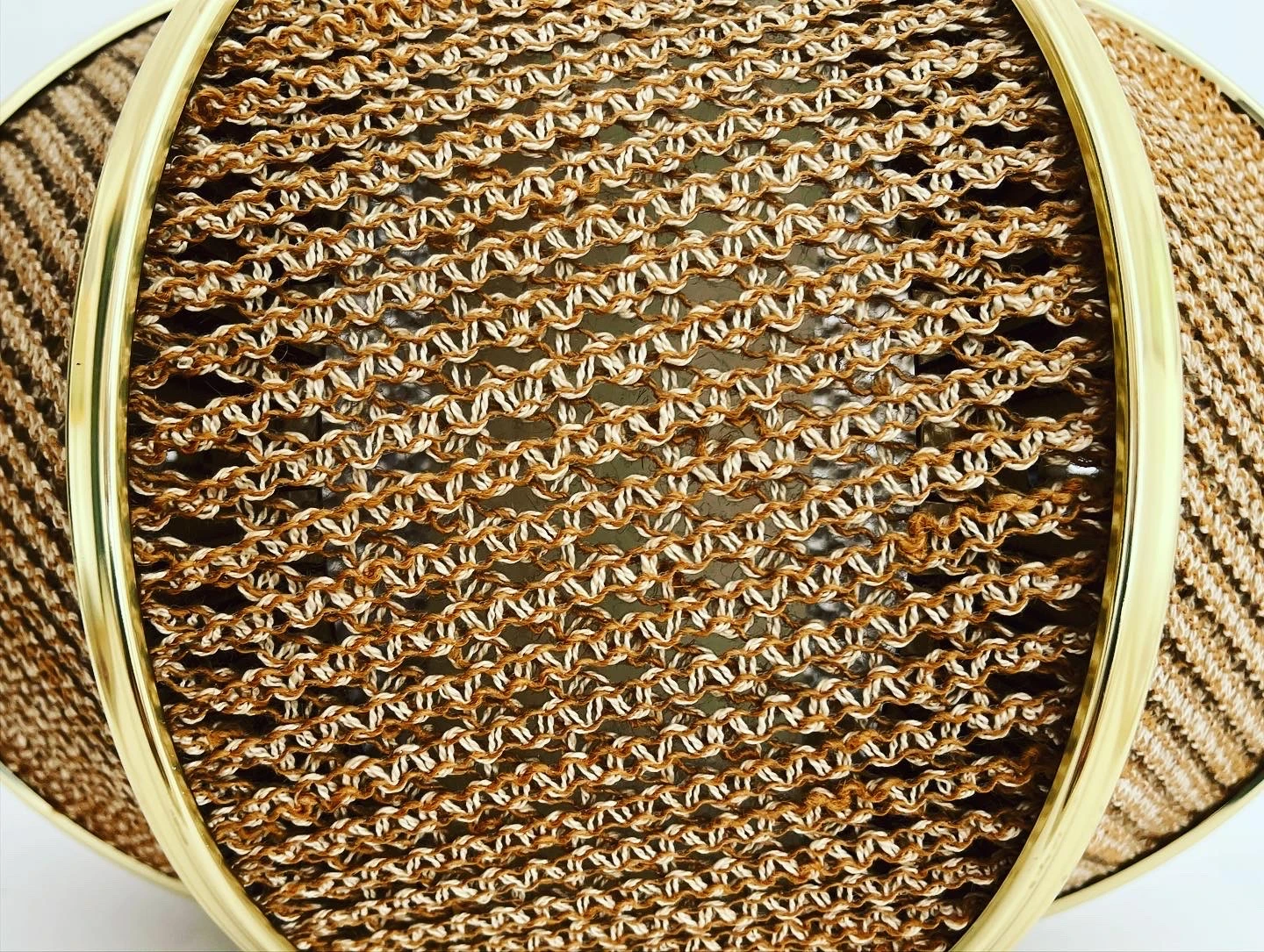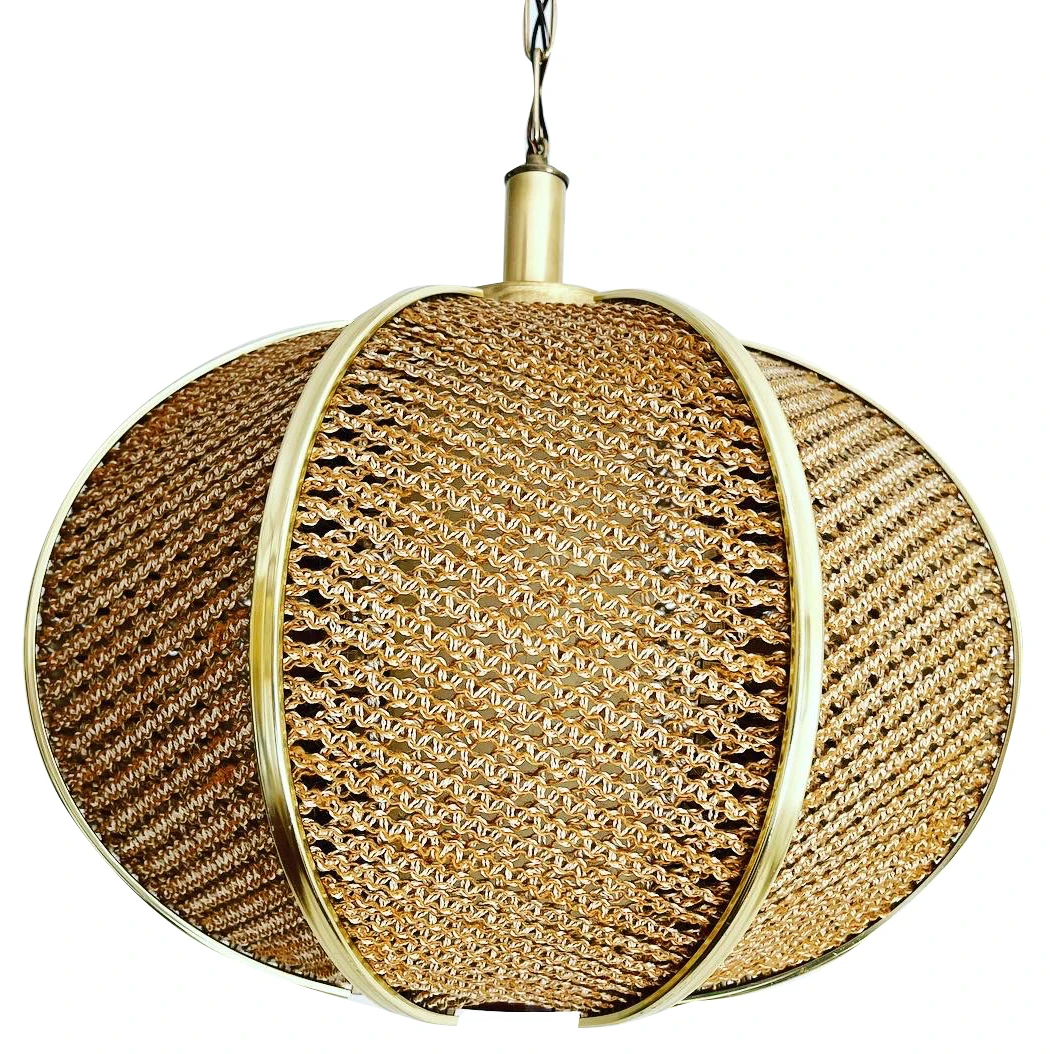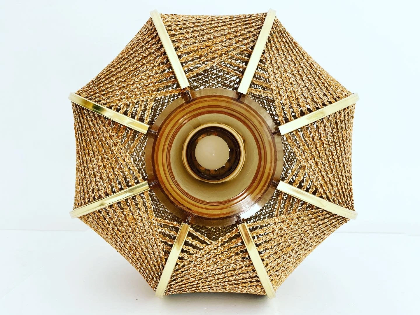 Large midcentury modern woven ribbed pendant light featuring a smoked Lucite frame woven in a crisscross pattern forming an octagonal sphere with original fiberglass diffuser and one light. Newly wired with new socket for one standard bulb. Comes ready to install with 36″L adjustable chain and original ceiling canopy and hardware. Small tear at top of interior diffuser, pictured.