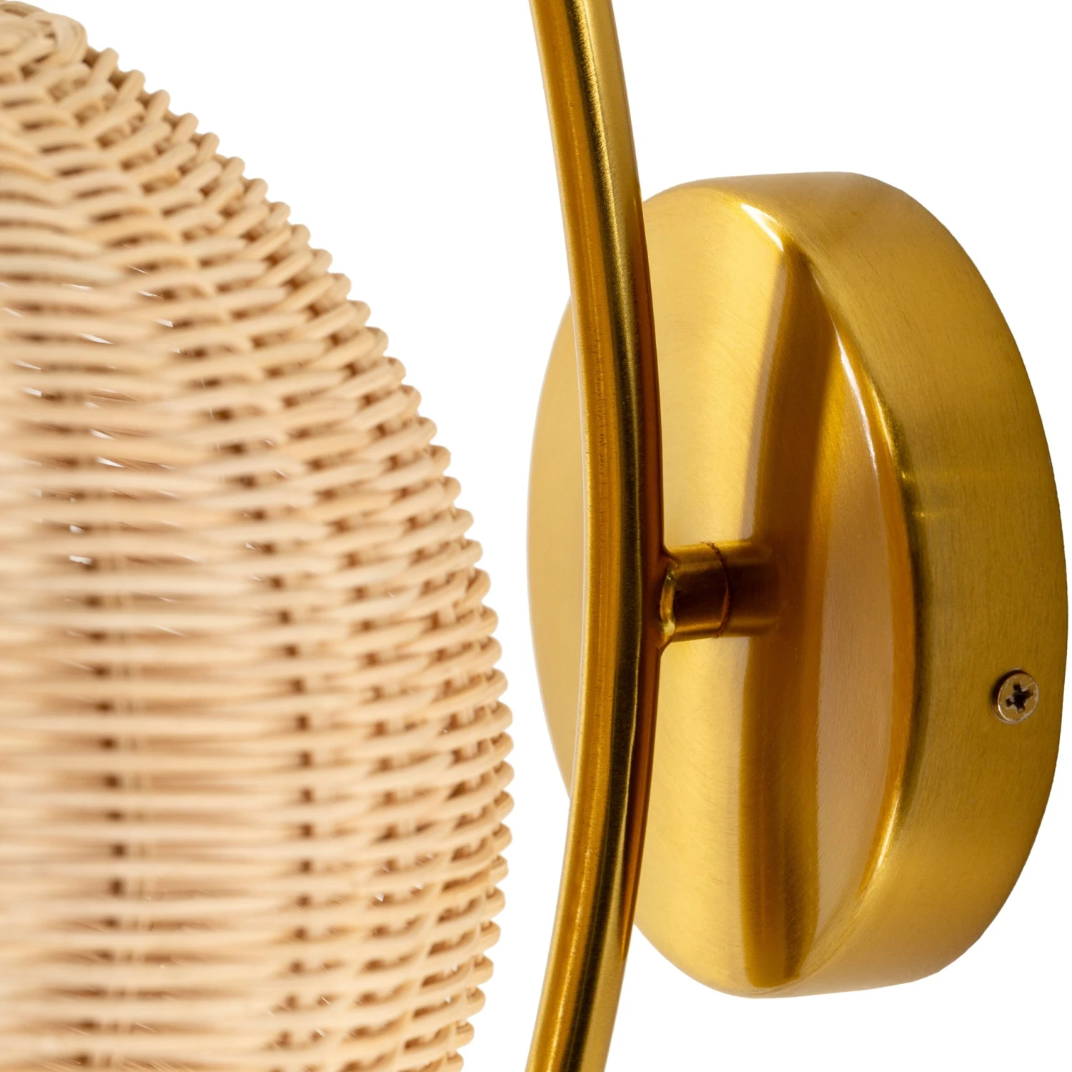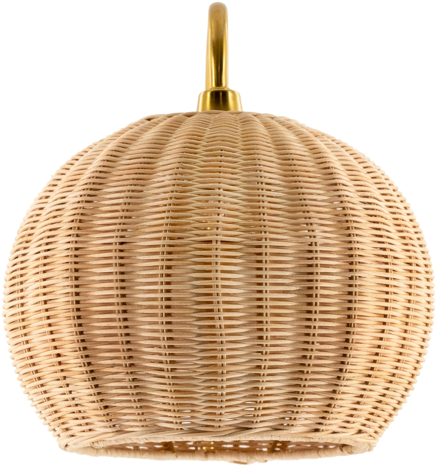 This sconce’s round rattan shade adds organic warmth and inviting texture to the sleek golden backplate and arm.
