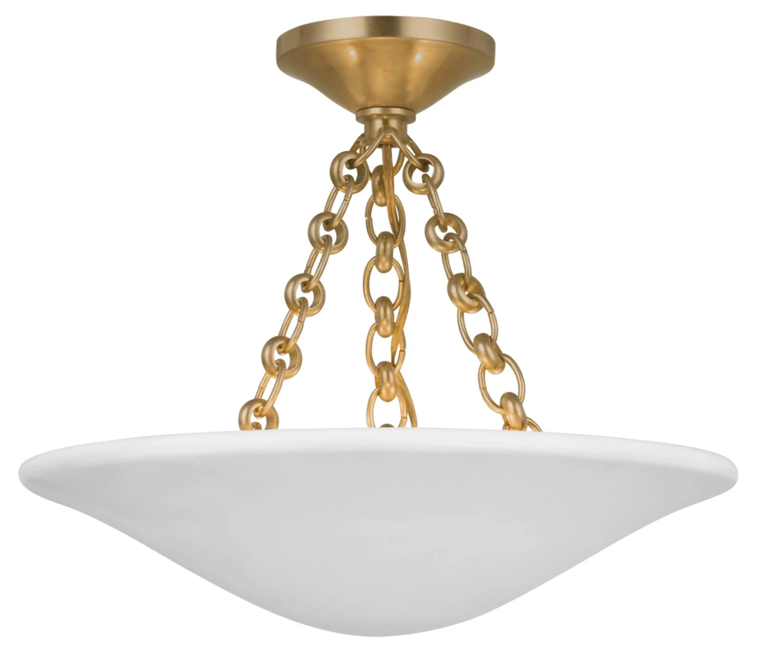With its white plaster shade suspended from three chains boasting a rich bronze finish, this three-bulb ceiling fixture is like jewelry for your home.