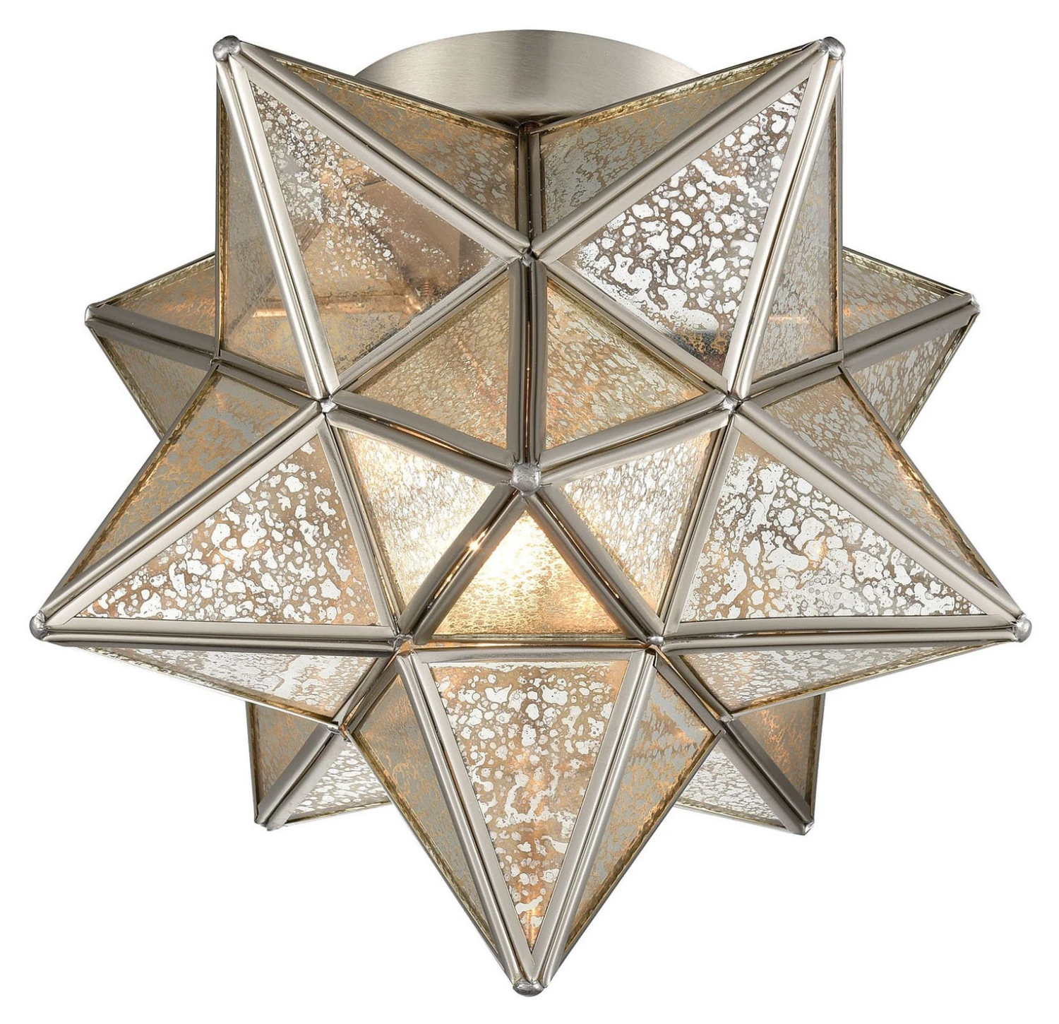 Exclusive to One Kings Lane: Since its origins in 19th-century Germany, the many facets and angles of the Moravian star have made it a popular motif for lighting. An antiqued nickel frame perfectly sets off the brilliance of the silvered glass panes. Hardwired.