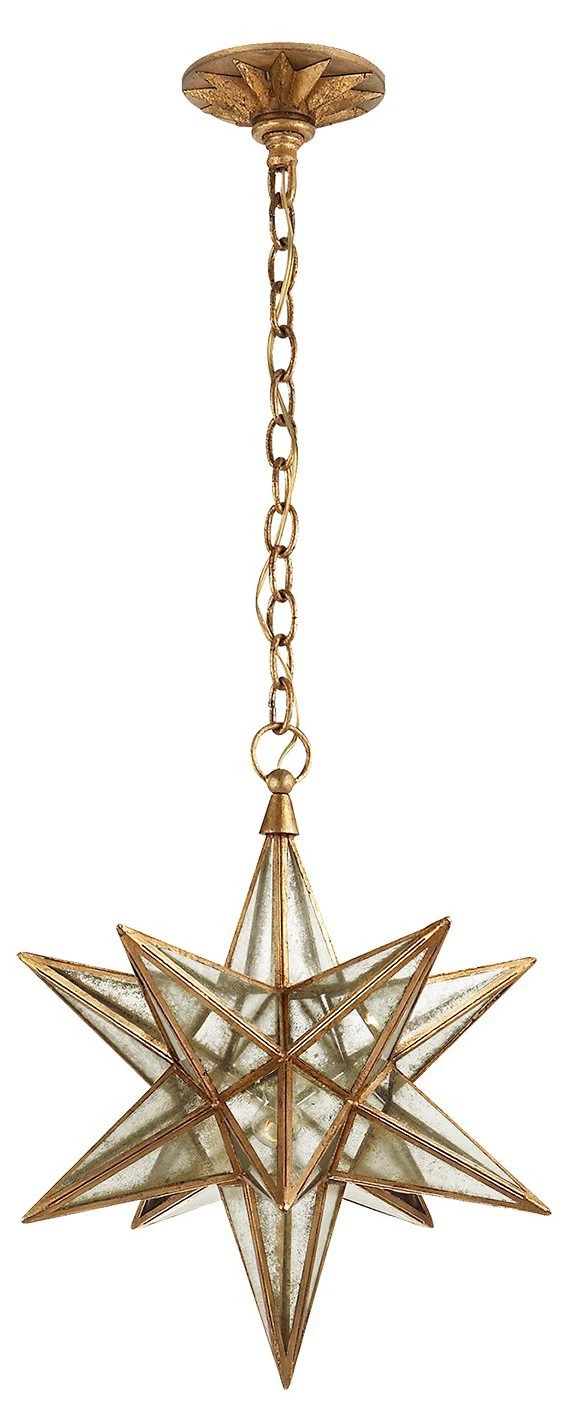 Since its origins in 19th-century Germany, the many facets and angles of the Moravian star have made it a popular motif for lighting. A gilded iron frame perfectly sets off the brilliance of many panes of glass. Hardwired.