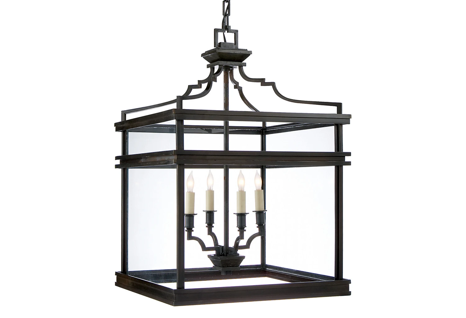 This cubic lantern adds an angular beauty to an entryway or dining room, finished in aged iron. Hardwired.