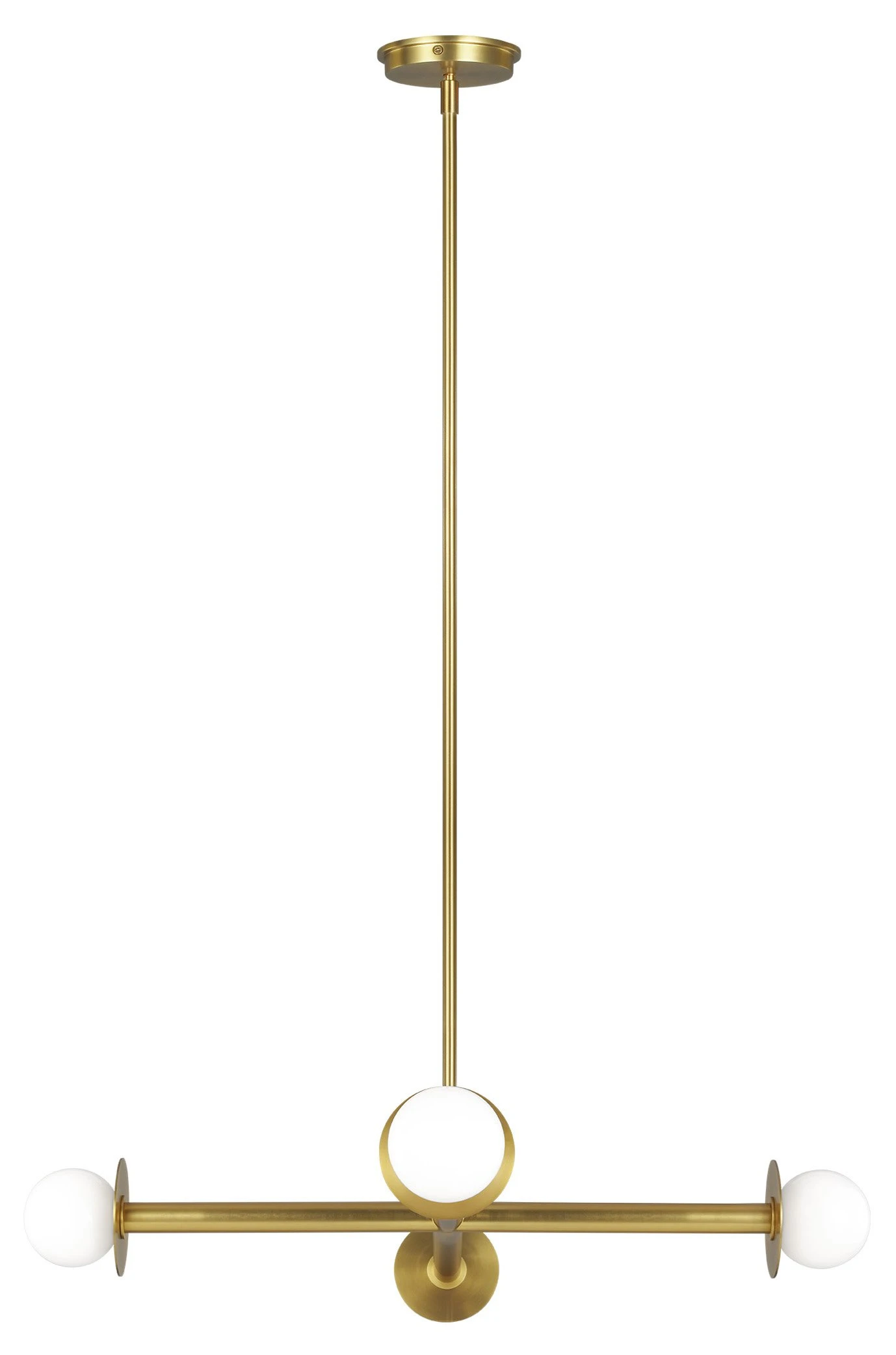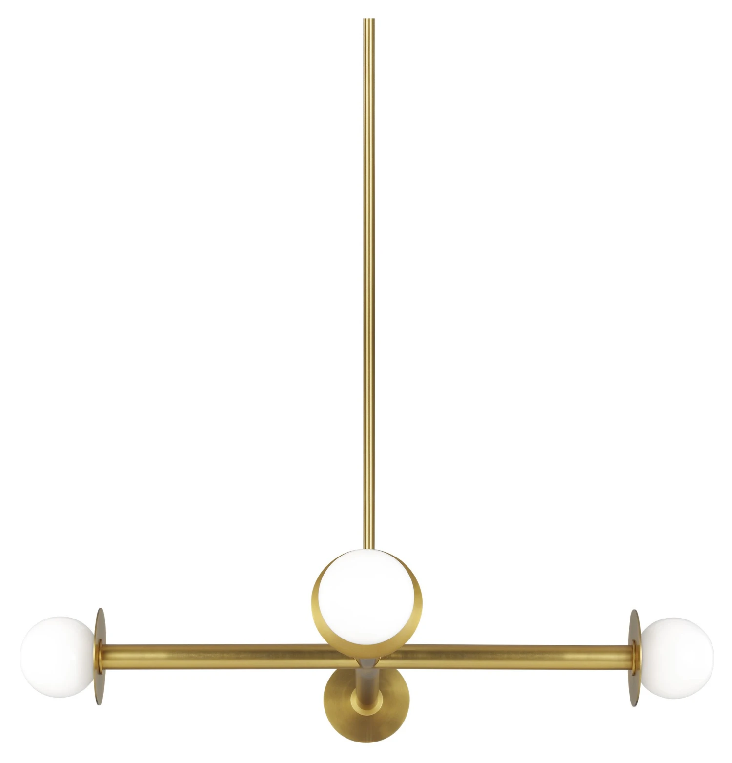 This four-arm chandelier is a dazzling study of contrasts: straight lines and graceful circles, opalescent mouth-blown milk glass and steel given a gleaming brass finish.