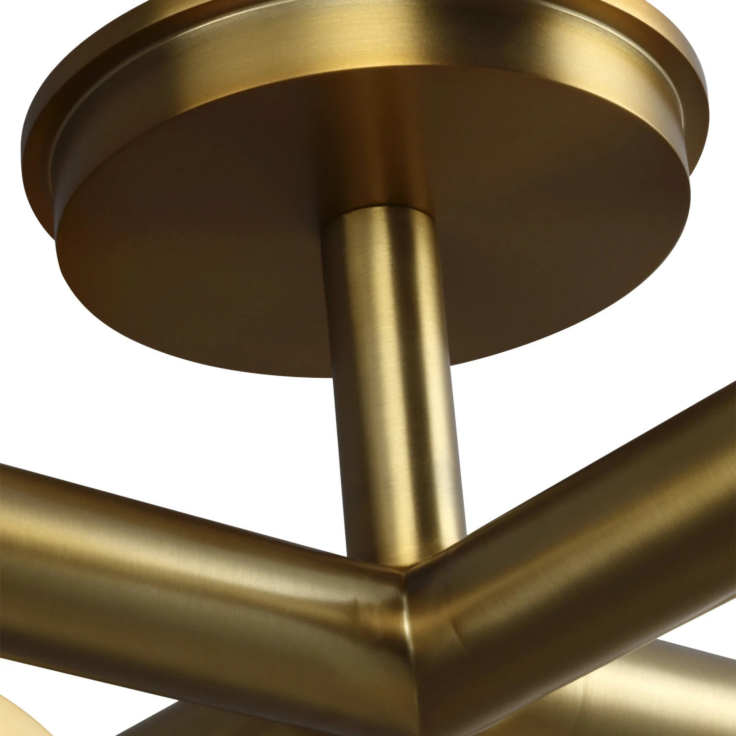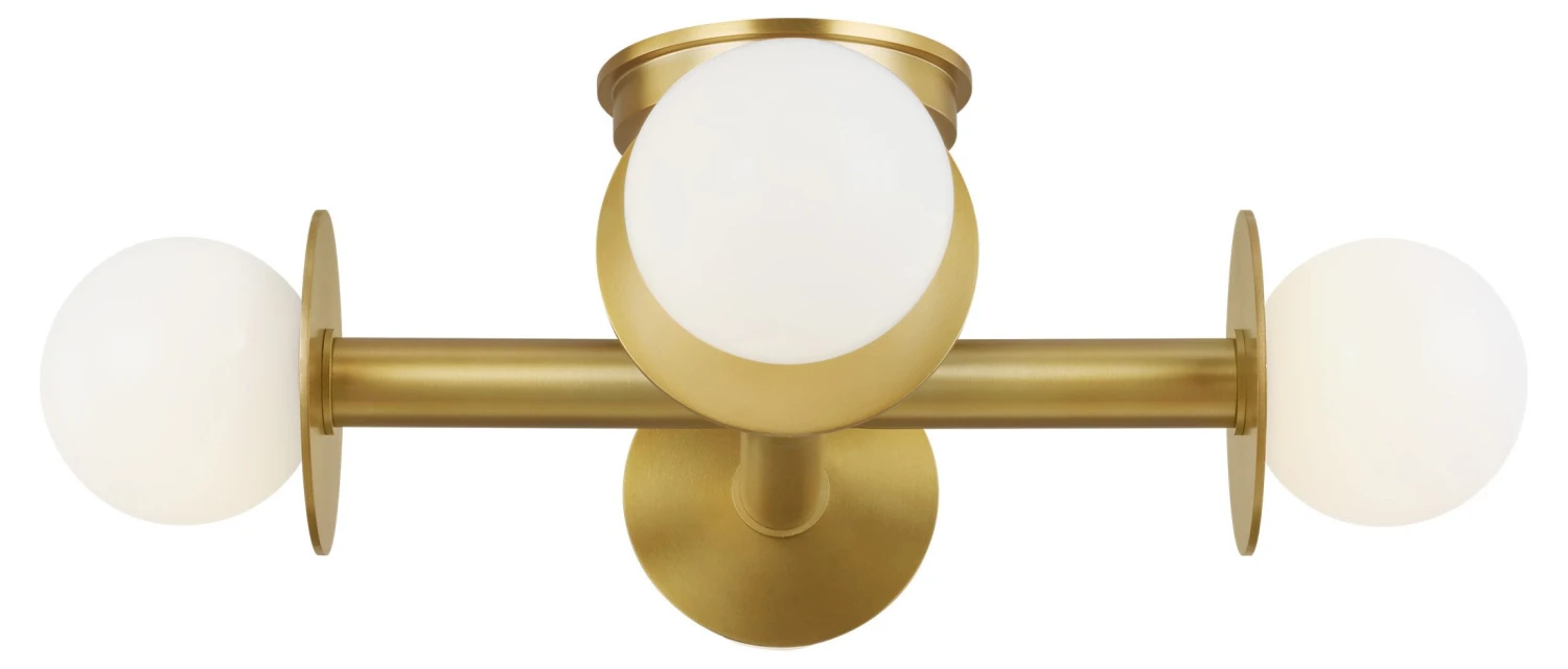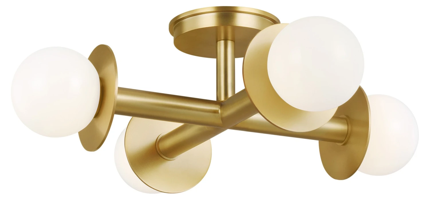 This four-arm flush-mount ceiling fixture is a dazzling study of contrasts: straight lines and graceful circles, opalescent mouth-blown milk glass and steel given a gleaming brass finish.