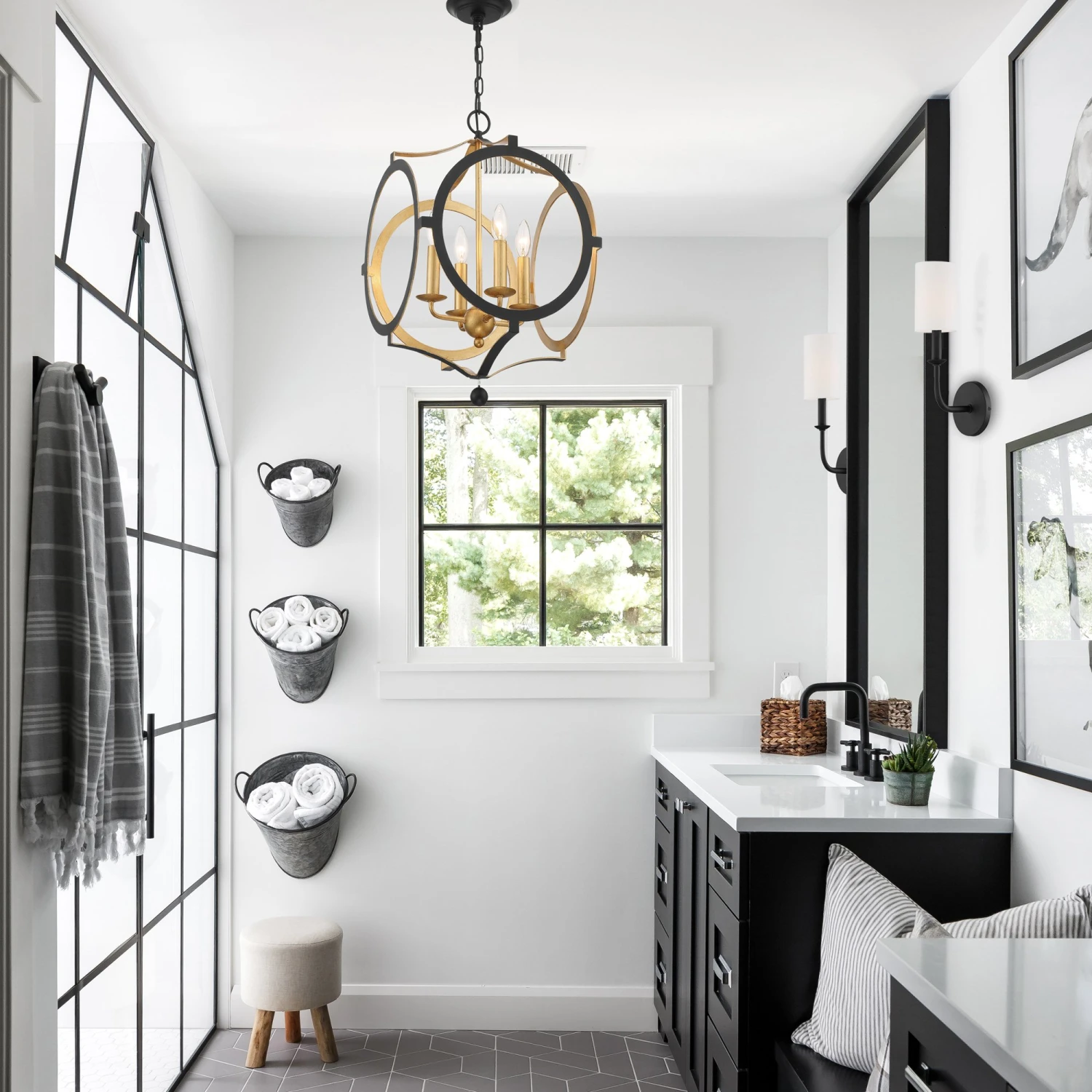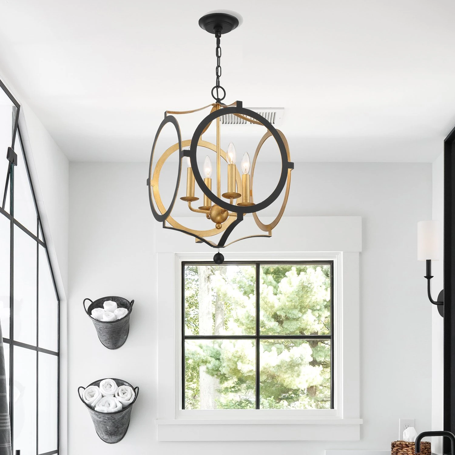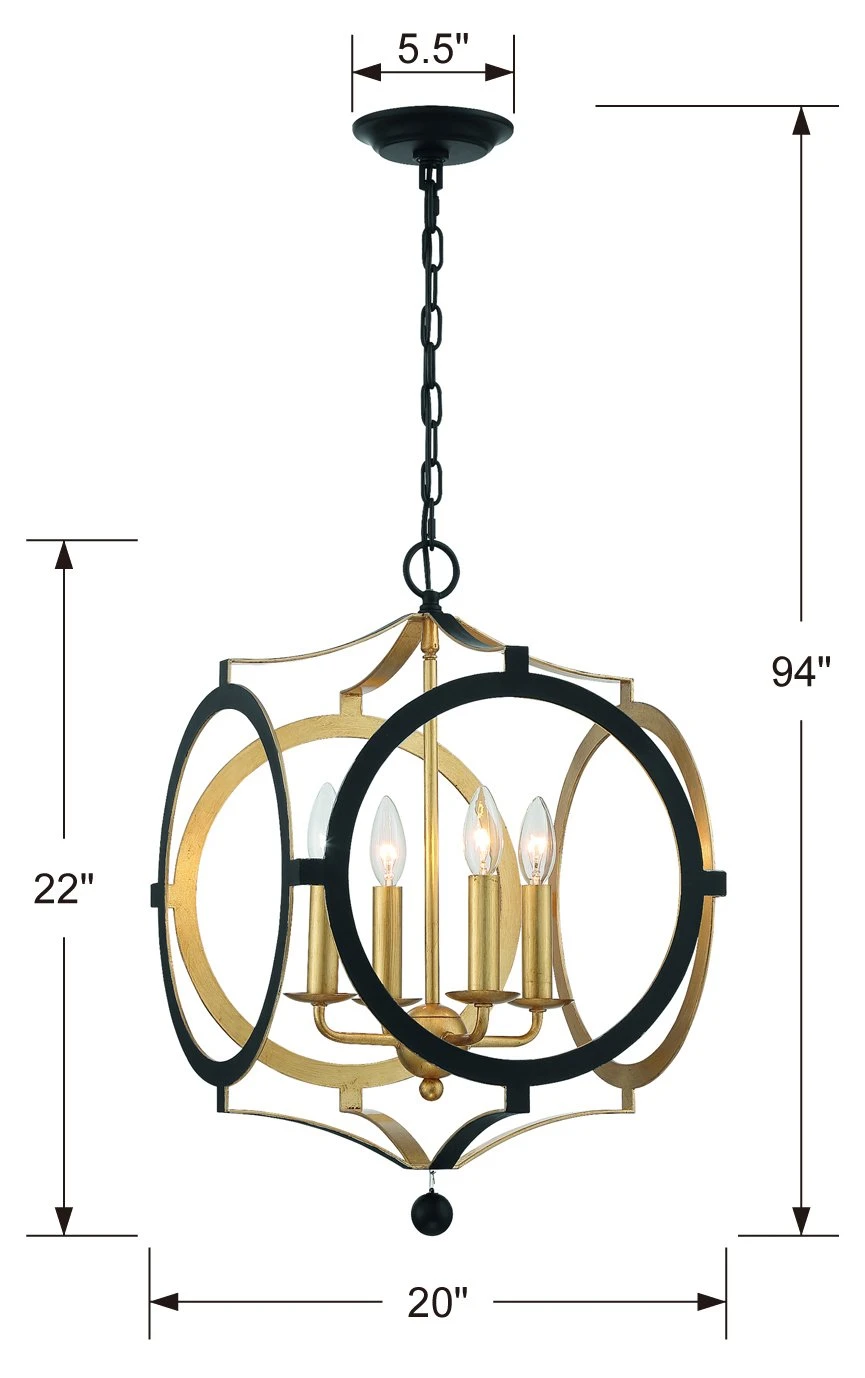 A wonderful way to add distinctive style to your decor, this chandelier is crafted of steel with an open frame and matte black finish. An antiqued gold interior completes the look and will illuminate any space with a warm, inviting glow. Hardwired.