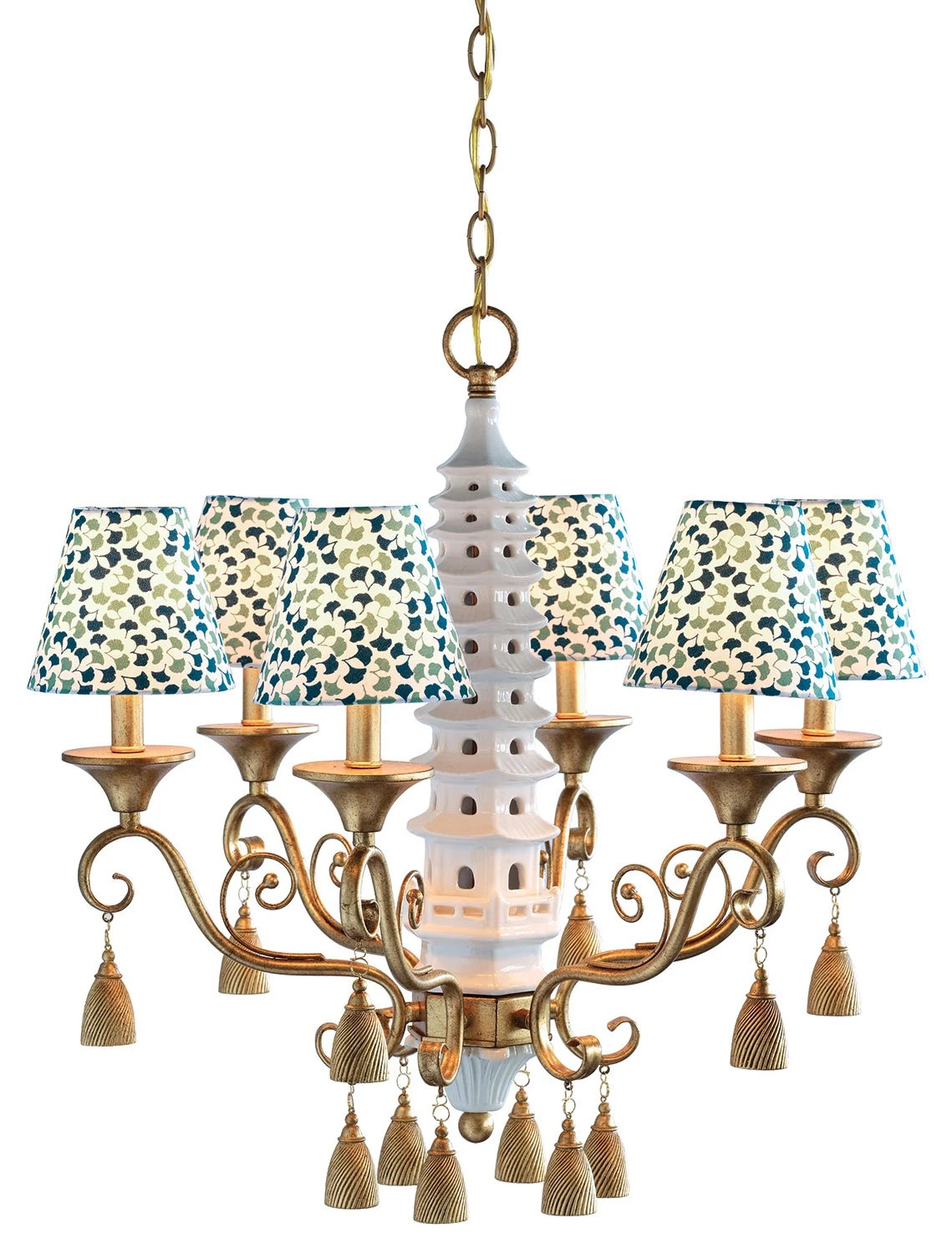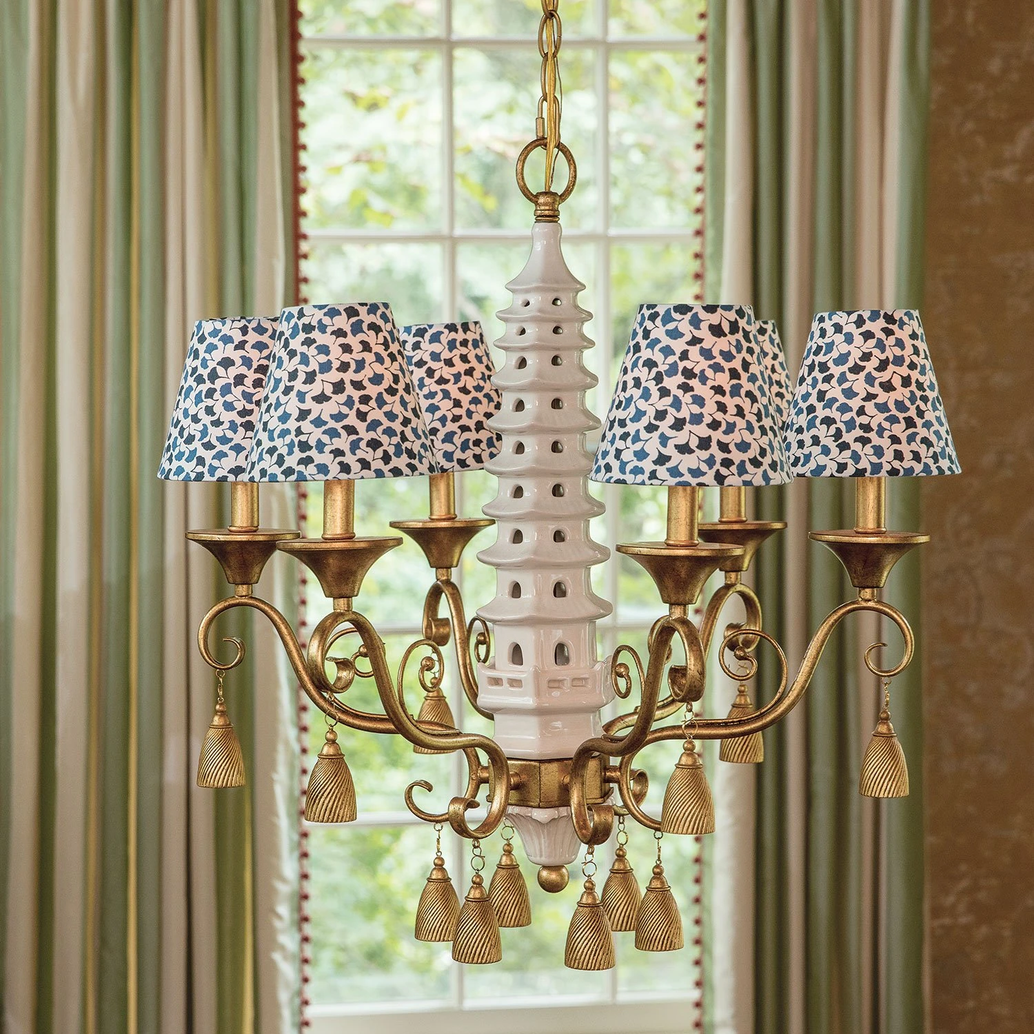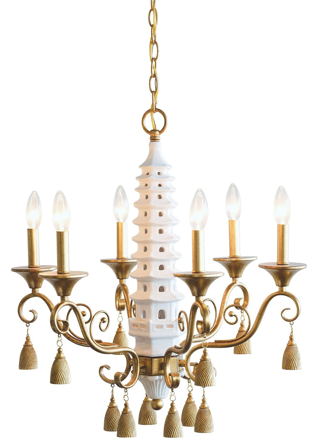 Designed by Madcap Cottage for Port 68, this eye-catching chandelier takes its inspiration from an antique piece. Crafted with a central porcelain pagoda surrounded by six scrolled steel arms with dangling steel tassels, this piece lends whimsy and glamour to its surroundings.