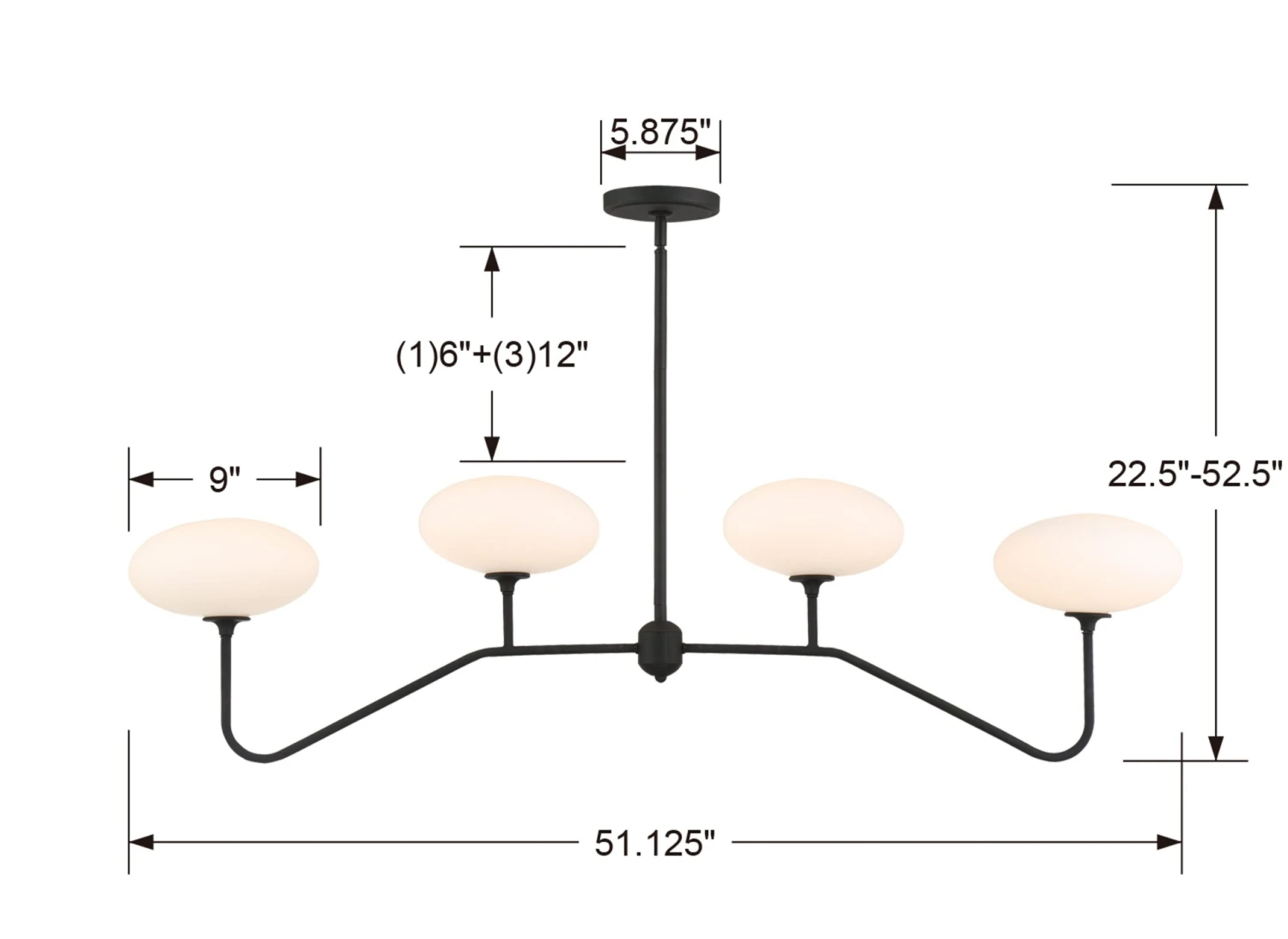 dimensions: 51.12″w x 9″d x 22.5”h; max height, 52.5″; shade, 9″dia; canopy, 5.88″dia