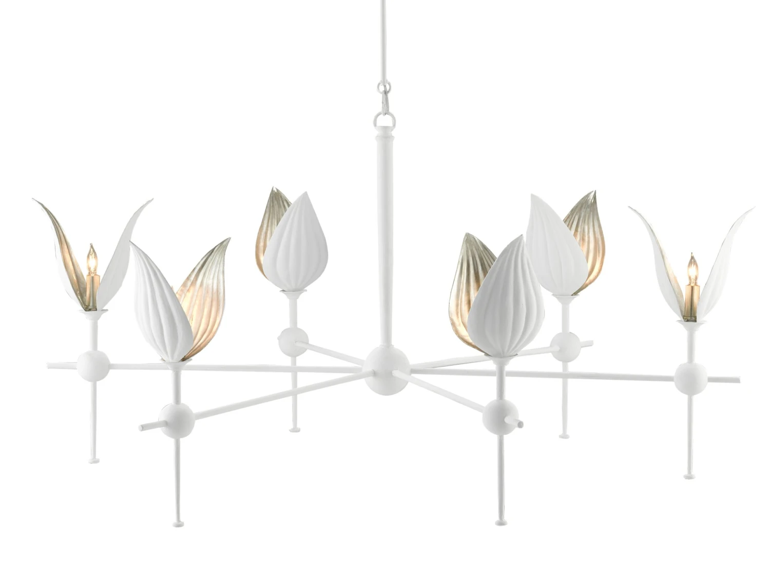 Paris in the 1920s inspired the gesso-white exterior finish of this six-arm chandelier, as well as the silver-leaf interior of the shades. Hardwired.