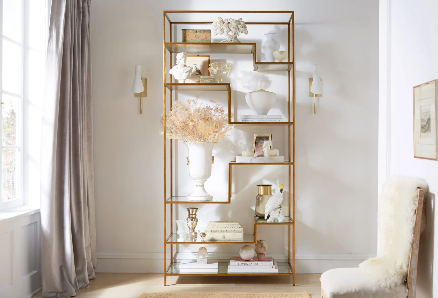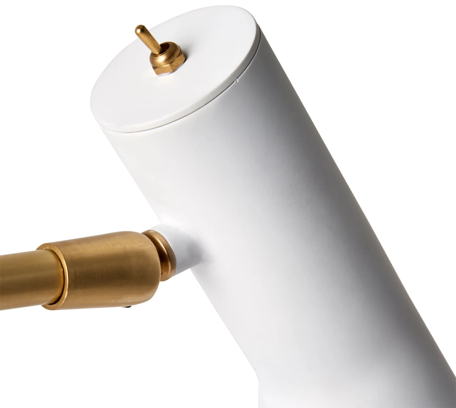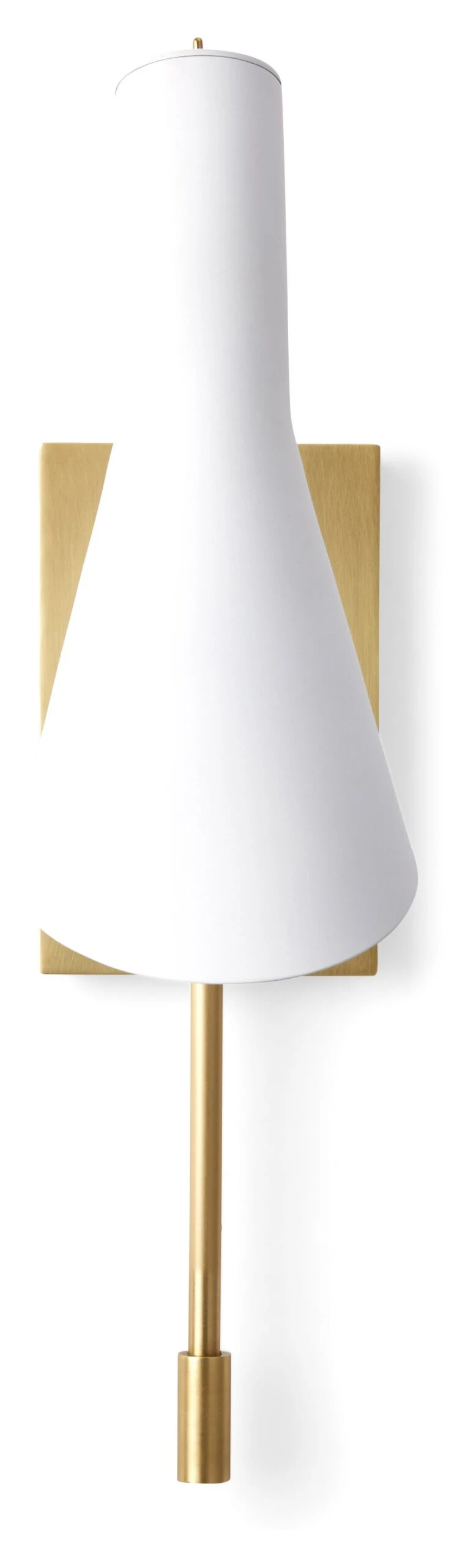 Designed by us and available only at One Kings Lane: Full of sophistication and midcentury appeal, this wall sconce is crafted of steel in an antiqued brass finish. A white cone-shaped shade with an up-and-down swivel functionality tops the design while a rectangular backplate anchors the piece. Bulb included.