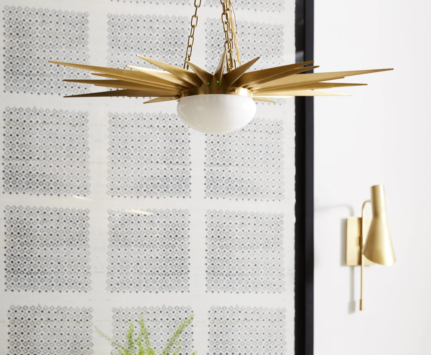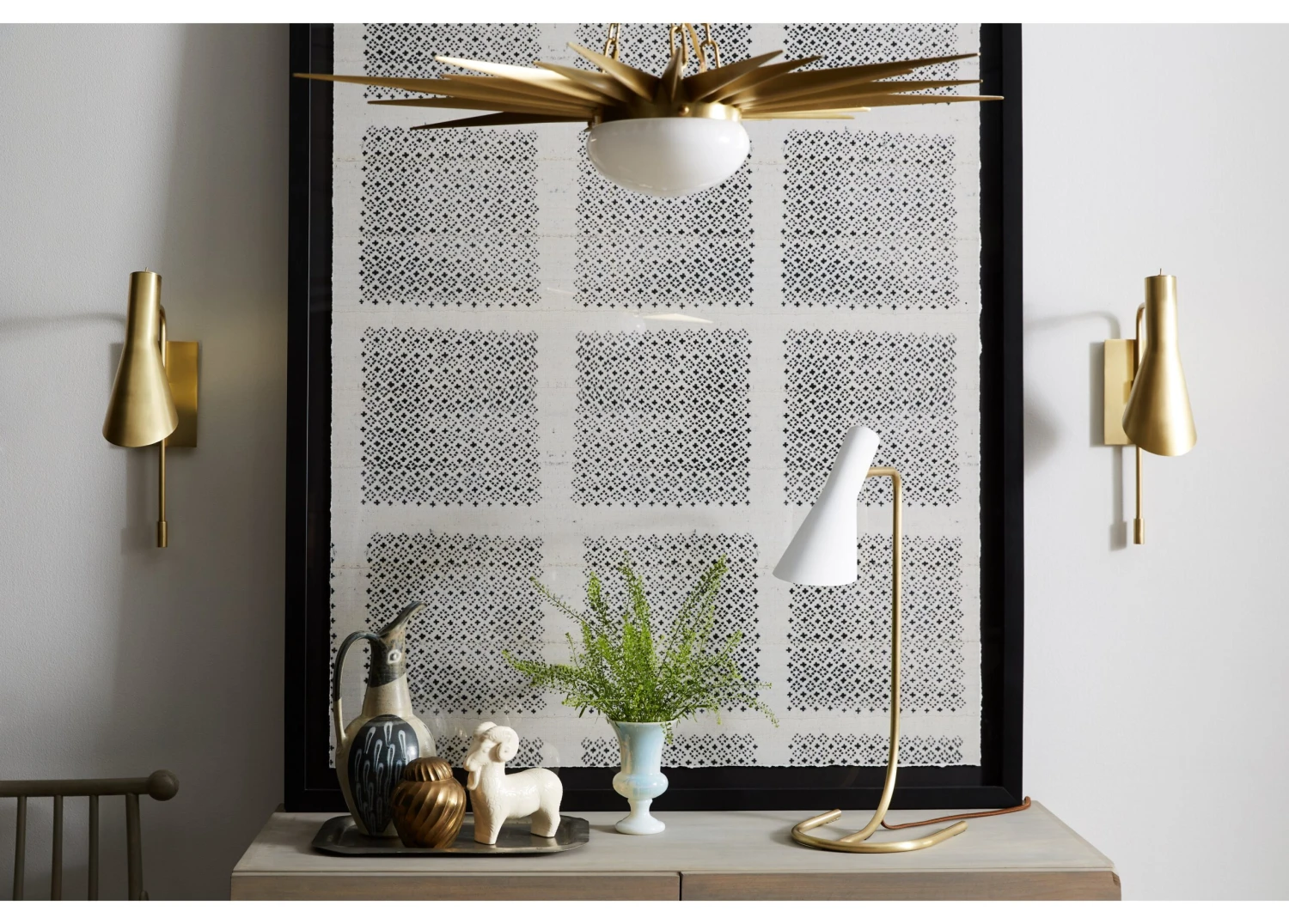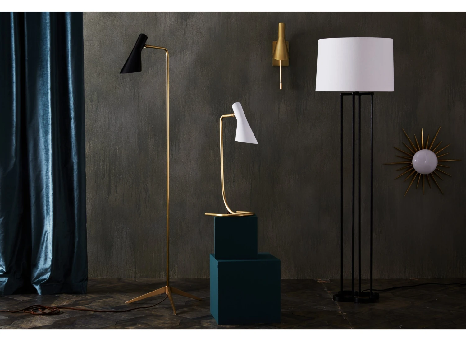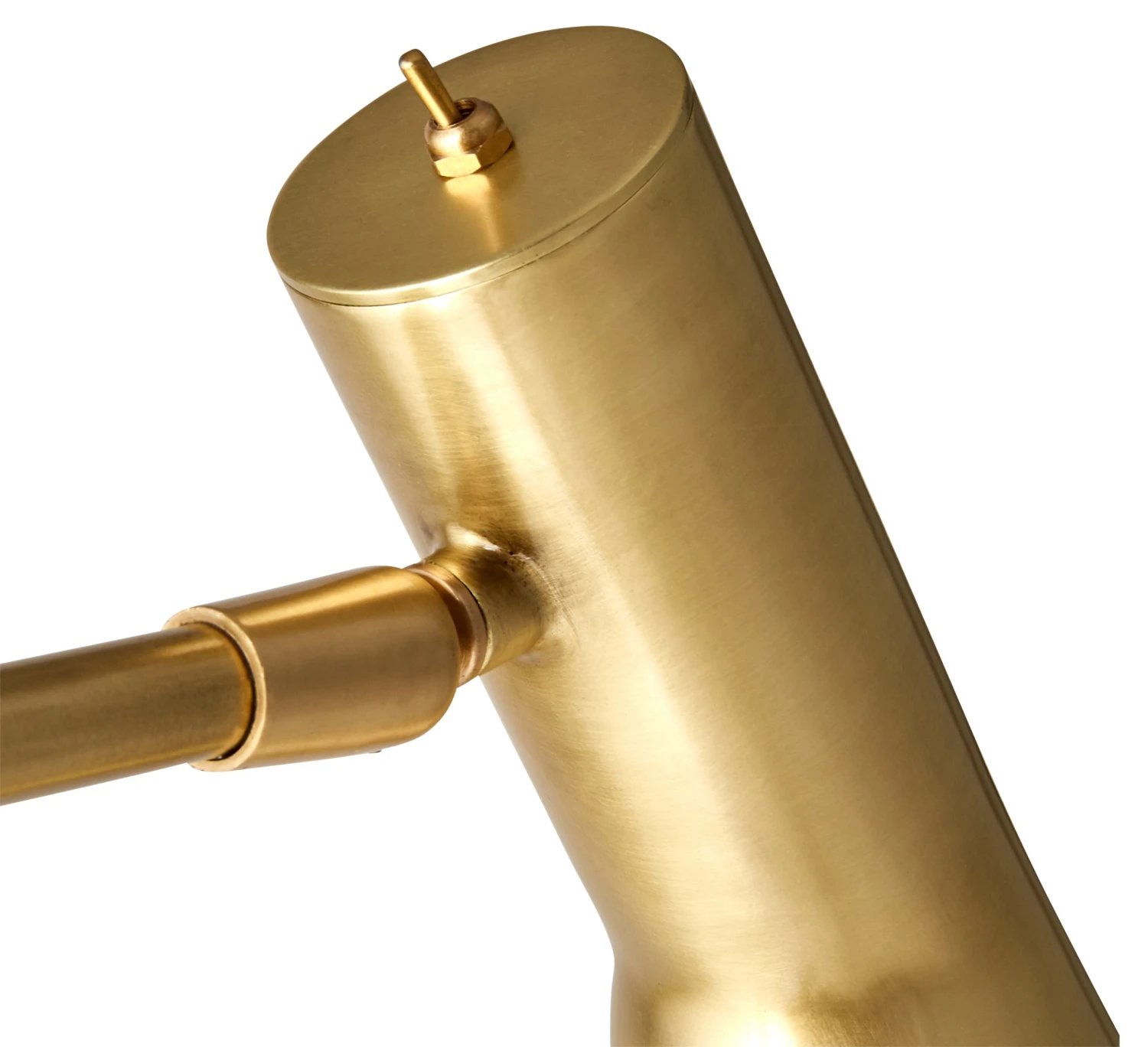 Designed by us and available only at One Kings Lane: Full of sophistication and midcentury appeal, this wall sconce is crafted of steel in an antiqued brass finish. A cone-shaped shade with an up-and-down swivel functionality tops the design while a rectangular backplate anchors the piece. Bulb included.