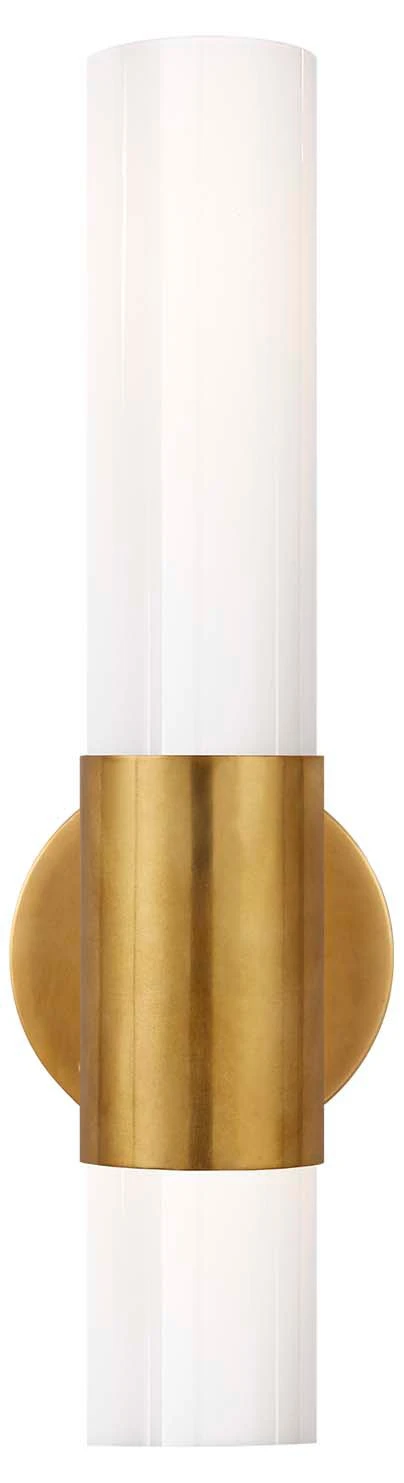 Modern refinement at its best, this sconce is crafted of brass with a warm, antiqued finish and tubular white glass shade. Because this item is damp rated, it can be used in any room of the home, including the bathroom. Hardwired.