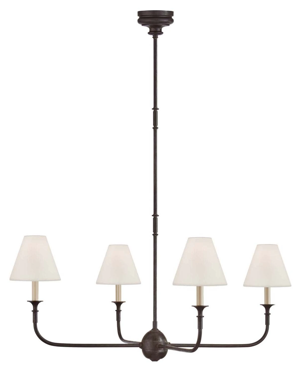 Simply elegant, this chandelier from designer Thomas O’Brien features four graceful, upturned arms and a two-tone finish in aged iron and ebonized oak. Off-white linen shades complete the look. Hardwired.