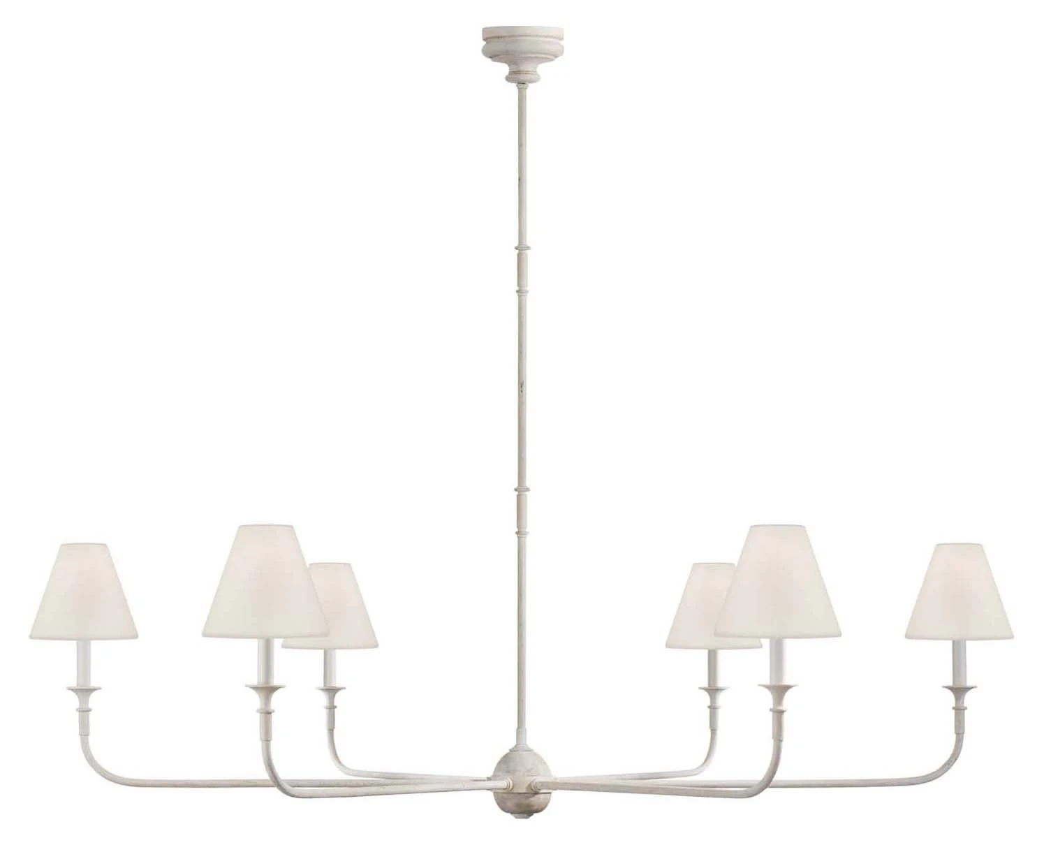Simply elegant, this chandelier from designer Thomas O’Brien features six graceful, upturned arms and a Swedish gray finish. Off-white linen shades complete the look. Hardwired.