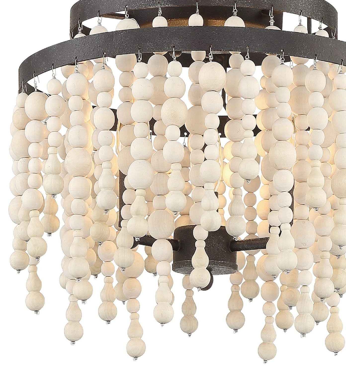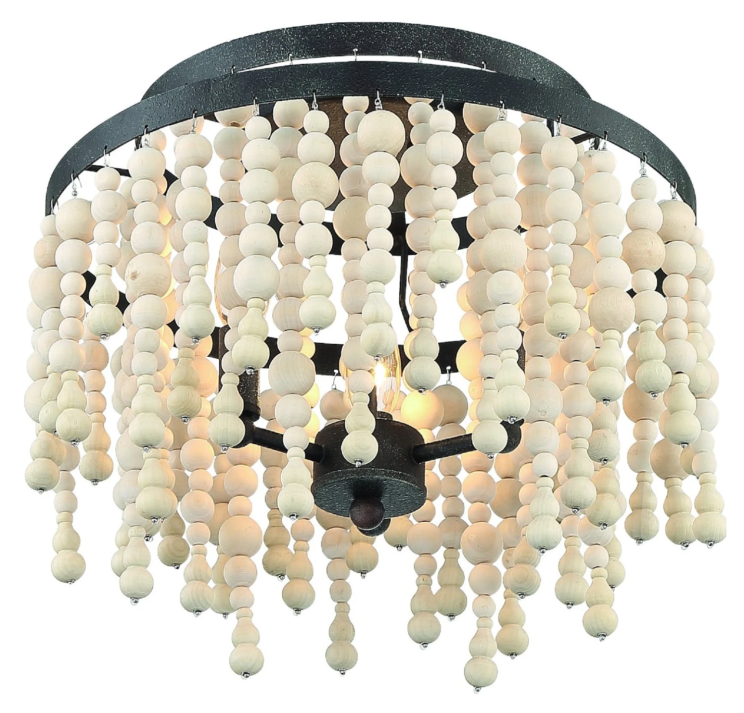 This flush-mount dresses up a classic steel structure with a bevy of draped wooden beads. Hardwired.